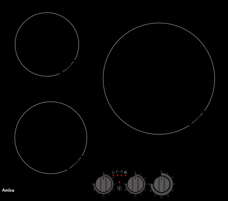 Plaque à induction Amica AIM3530 58 cm en vitrocéramique noire avec 3 foyers, détection automatique de récipient, indicateur de chaleur résiduelle, 9 niveaux de puissance et 2 300 W sur la zone la plus puissante ; commandes frontales mécaniques et câble d’alimentation 1 m fourni. Design facile à nettoyer et encastrable, installation à fleur ou en affleurement. Garantie 2 ans.