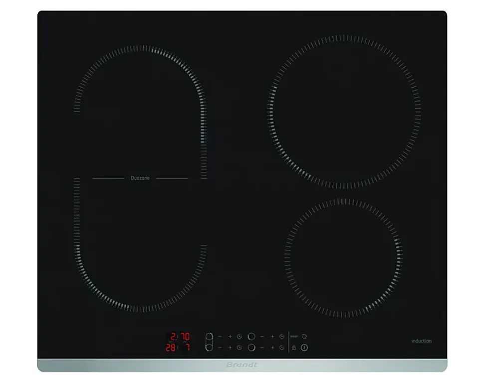 Table de cuisson induction 60cm 4 feux 7200w noir Brandt – Table induction Brandt BPI6425X, chaque foyer induction dispose de commandes dédiées, pour cuisiner avec précision et rapidité. Pour plus de confort, ils sont équipés d’une minuterie indépendante. – Type de produit : Table induction.Energie : Electricité.Hotte intégrée : Non.Nbre foyer(s) : 4.Touche(s) sensitive(s) : Oui.Type de commande(s) : Tactiles.Position des commandes : Frontale.Zone de cuisson modulable (flex) : Oui.Zone ovale : Oui.Foyer le + puissant (W) : 3 600.Matière de la surface : Vitrocéramique.Type de cadre : Sans cadre.Le(s) plus-produit(s) : DuoZone (38 x 18 cm).Couleur : Noir.Couleur(s) secondaire(s) : Inox.Connecté : Non.Nbre de positions de cuisson : 10.Booster(s) : Oui.Minuterie : Oui.Témoin(s) de chaleur résiduelle : Oui.Verrouillage des commandes / Sécurité enfant : Oui.Détection de casseroles : Oui.Témoin de mise sous tension : Oui.Puissance de raccordement (W) : 7200.Tension (V) : 220-240.Fréquence (Hz) : 50, 60.Longueur du cordon (m) : 1.3.Largeur (cm) : 58.Profondeur (cm) : 51.Encastrement H x L x P (cm) : 56 x 49.Poids (kg) : 10.12.