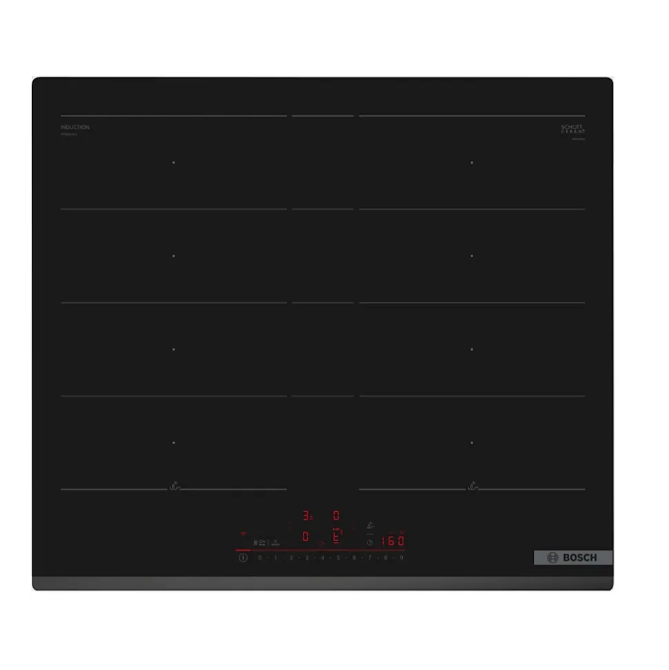 Table de cuisson induction 60cm 4 feux 7400w noir Bosch – La table de cuisson PXY63KHC1E de Bosch doté d’une fonction PowerManagement qui permet de réduire la puissance de la table pour convenir à toute installation électrique. Lors du déplacement d’une casserole, les réglages s’ajustent instantanément et la zone de cuisson s’adapte à la taille de l’ustensile de cuisson. Pan Boost, sélectionnable via le bouton Favoris/Home Connect App (disponibilité prévue pour Q4/2024 via une mise à jour logicielle pour les appareils connectés à Home Connect).. Chauffez les poêles plus rapidement qu’en puissance max. tout en protégeant leurs revêtements. Les zones de cuissons sont automatiquement assemblées ou dissociées en fonction de la taille des poêles et casseroles. Sélection automatique des zones : lors de la mise en marche, la table de cuisson sélectionne automatiquement la zone de cuisson sur laquelle est placé le nouvel ustensile de cuisson FlexMotion : reconnaissance des déplacements des récipients : lorsque vous déplacez une casserole vers une autre zone de cuisson, transférez tous les réglages précédents vers la nouvelle zone par la simple pression d’un bouton. Fonction QuickStart : détection automatique des récipients sur la zone de cuisson. Fonction ReStart : en cas d’arrêt involontaire, rétablissez tous les réglages précédents en remettant la table de cuisson en marche dans les 4 secondes. Bouton favoris : accédez directement aux fonctions favorites grâce à un bouton configurable. PerfectFry Plus Sensor : maitrisez la cuisson grâce à la régulation automatique de la température via un capteur intégré Connectivité. Home Connect : vérifiez si la table de cuisson est éteinte même en dehors de chez vous, et trouvez des recettes ou des fonctions supplémentaires dans l’application Home Connect. Assistant cuisson : trouvez facilement le bon réglage de température d’un plat via l’application Home Connect. CookConnect : la hotte s’active automatiquement pendant les cuissons