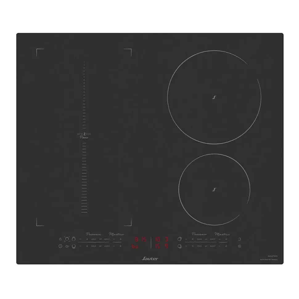 Table de cuisson induction 60cm 4 feux noir Sauter – Table de cuisson spi5431m de Sauter.Excelsior : Le verre Excelsior, conçu et fabriqué en France, vient moderniser les tables de cuisson en leur apportant une combinaison unique grâce à sa résistance aux rayures, sa facilité d’entretien et son design.Fonction Piano : La touche dédiée fonction piano, préprogrammée, divise l’espace horiZone en deux puissances distinctes. La zone avant permet de saisir les aliments pour ensuite les maintenir au chaud en faisant glisser le récipient sur la zone arrièreCommandes dédiées : Chaque foyer a 14 positions de cuisson qui permettent un réglage très précis des températures. Il bénéficie en outre de 3 accès directs dont un Booster . Ces accès programmables (6–10) permettent un accès plus rapide aux puissances désirées. – Type de produit : Table de cuisson.Type de plaque induction.Puissance maxi électrique (kW) : 7.4.Fusible (A) : 32.Tension (V) : 220-240.Fréquence (Hz) : 50/60.Nombre de foyers : 4Consommation d’énergie électrique totale (EC) : 176.6.Consommation en veille (W) :Puissance max (W) : 2800/2200/3700.Dimensions de la zone de cuisson (mm) : 230X200/160/210.Longueur du cordon électrique (cm) : 130.Matériau de la table : Vitroceramique,Verre antirayures.Type de commandes desfoyers : Touchessensitives.Type de minuterie: Electronique 99 min.Type d’électronique : Led rouge.Type de prise : Sans.Type d’énergie : ElectricitéAccessoiresfournis : Joint d’étanchéitéCouleur : Noir.Dimensions du produit nu HxLxP (mm) : 60 x 600 x 520.Découpe du plan de travail LxP (mm) : 560 x 490.Couleur : Noir.Poids net (kg) : 10.10.