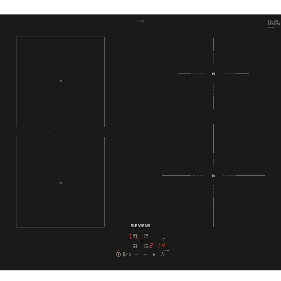 Table de cuisson induction 60cm 4 foyers 4600w noir Siemens – Avec la table combiInduction iQ500 Siemens EE611BPB5E, des nouvelles possibilités de cuisson s’offrent à vous. La technologie combiInduction vous permet de cuisiner avec de grands récipients. Le bandeau touchControl permet de contrôler très précisément chacune des quatre zones de cuisson. Fonction powerBoost : jusqu’à 50 % de puissance en plus sur une zone à induction. Minuterie avec coupure automatique : la zone de cuisson se coupe automatiquement lorsque le temps de cuisson est écoulé. La sécurité enfants bloque toutes les fonctions, prévenant un allumage accidentel. – Type de produit : Table de cuisson 60 cm.combiZone.Zone de cuisson avant gauche : 180 mm, 1.8 kW (PowerBoost 3 kW).Zone de cuisson arrière gauche : 180 mm, 1.8 kW (PowerBoost 3 kW).Zone de cuisson arrière droite : 145 mm , 1.4 kW (PowerBoost 2.2 kW).Zone de cuisson avant droite : 210 mm, 2.2 kW (PowerBoost 3 kW).Commande touchControl (+/-).17 positions de réglage.quickStop : éteignez rapidement une zone de cuisson en appuyant longuementTimer avec fonction arrêt : éteint la zone de cuisson à la fin du temps programmé (ex. : pour les œufs à la coque).Timer : une alarme retentit à la fin du temps programmé (ex. : pour les pâtes).powerBoost sur chaque foyer.Fonction QuickStart.Fonction ReStart.Sans cadre.Interrupteur principal.Témoin de chaleur résiduelle à 2 niveaux.Sécurité surchauffe.Sécurité enfants.Épaisseur minimale du plan de travail : 16 mm.Puissance de raccordement : 4.6 kW.Fonction PowerManagement.Design : Encastrable.Type d’énergie : Électrique.Nombre de foyers : 4.Témoin de chaleur résiduelle : Indépendant.Emplacement du bandeau de commande : Devant.Matériau de la surface : Vitrocéramique.Longueur du cordon électrique : 110.0 cm.Tension : 220-240 V.Couleur de la surface :