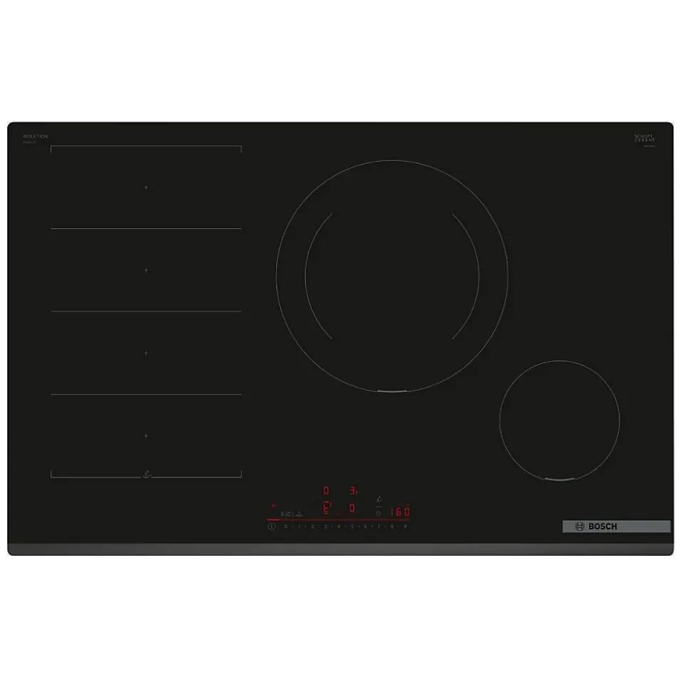 Table de cuisson induction 80cm 4 feux 7400w noir Bosch – La table de cuisson PXE831HC1E de Bosch connectée pour faciliter votre vie au quotidien. Vérifiez si la table de cuisson est éteinte même en dehors de chez vous, et trouvez des recettes ou des fonctions supplémentaires dans l’application Home Connect. Doté d’une fonction ReStart pour rétablir tous les réglages précédents en remettant la table de cuisson en marche dans les 4 secondes en cas d’arrêt involontaire. La hotte s’active automatiquement pendant les cuissons grâce à la connexion WiFi (voir modèles compatibles) grâce à la technologie CookConnect et adapte la vitesse de la hotte grâce aux données de cuisson fournies en continu par la table de cuisson (avec une hotte adaptée et un compte Home avec Smart Hood Automatic. PerfectFry Plus : commande directe et simple avec capteur de température pour éviter les brûlures. FlexMotion : reconnaissance des déplacements des récipients : lorsque vous déplacez une casserole vers une autre zone de cuisson, transférez tous les réglages précédents vers la nouvelle zone par la simple pression d’un bouton. Pan Boost, sélectionnable via le bouton Favoris/Home Connect App (disponibilité prévue pour Q4/2024 via une mise à jour logicielle pour les appareils connectés à Home Connect).. Chauffez les poêles plus rapidement qu’en puissance max. tout en protégeant leurs revêtements. – Type de produit : Table de cuisson induction.Appellation produit/famille : Foyer en vitrocéramique.Type de construction : Encastrable.Type de table : Electrique.Nombre de foyers : 4.Témoin de chaleur résiduelle : Indépendant.Emplacement du bandeau de commande : Devant de la table.Matériau de la surface : Vitrocéramique.1 zone flex .Table de cuisson 80 cm : espace pour 4 casseroles ou poêlesZone de cuisson avant gauche : 200 mm, 230 mm, 2.2 kW(PowerBoost 3.7 kW).Zone de cuisson arrière gauche : 200 mm, 230 mm, 2.2 kW (PowerBoost 3.7