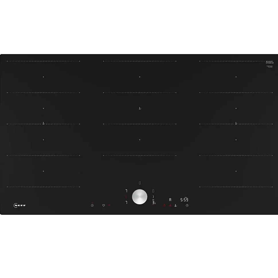 Table de cuisson induction 90cm 5 feux 1100w noir Neff – Plaque de cuisson à induction Flex autonome N 90 Neff T69PTX4L0 avec commande Twist Pad. Flex Induction : votre table de cuisson détecte chaque casserole et chauffe exactement la zone correspondante. Hotte contrôlable via la table de cuisson – commande pratique de la hotte par la plaque de cuisson. Power Boost : boostez la puissance de vos plaques quand vous avez besoin de chauffer plus vite. Induction : la chaleur est générée directement dans la casserole pour une cuisson précise qui s’arrête dès que le courant est coupé. – Type de tables de cuisson : Table induction.Largeur : 90 cm.Nombre de foyers : 5.Dimension des zones de cuisson : 1 x (30,0 x 23,0 cm), 1 x (40,0 x 23,0 cm), 1 x (40,0 x 23,0 cm).Puissance des zones de cuisson : 1 x 2.6 (3.7) kW, 4 x 2.2 (3.7) kW.Matériau de base de la surface : Vitrocéramique.Design : A fleur de plan.Puissance de raccordement : 11 100 W.Tension : 220-240 V.Longueur du cordon électrique : 110,0 cm.Système de commande : TwistPad.Nombre : 17 positions de réglage.Power Boost – chauffe plus rapidement : Oui.activeLight Plus : non.Frying sensor : Oui.cookingSensor : capteur de température des liquides (en option) : non.Quick start : Oui.Fonction maintien au chaud : non.Minuterie : Oui.Home Connect – Commande et diagnostic à distance : Oui.Home Connect : iService Remote.Contrôle de la hotte via la table de cuisson : Oui.Témoin de chaleur résiduelle : Indépendant.Dispositif de sécurité : détection de casserole, Fonction de gestion d’énergie, fonction pause, limitation de durée, sécurité-enfants.Accessoires inclus : 1 x Twist Pad.Couleur et finition : Noir.Dimensions niche H x L x P : 56 x 896 x 516 mm.Dimensions appareil H x L x P : 56 x 892 x 512 mm.Poids net : 17.8 kg.