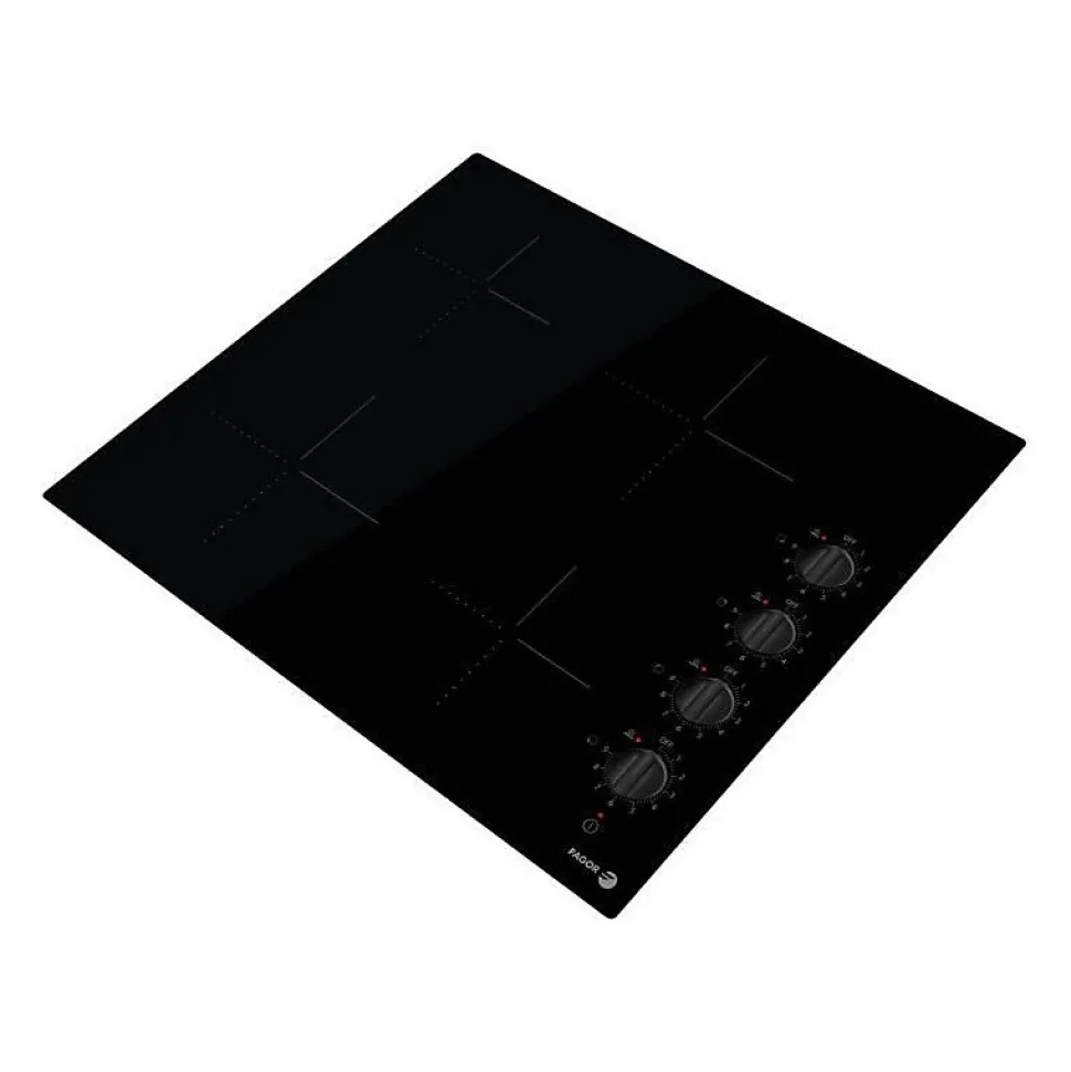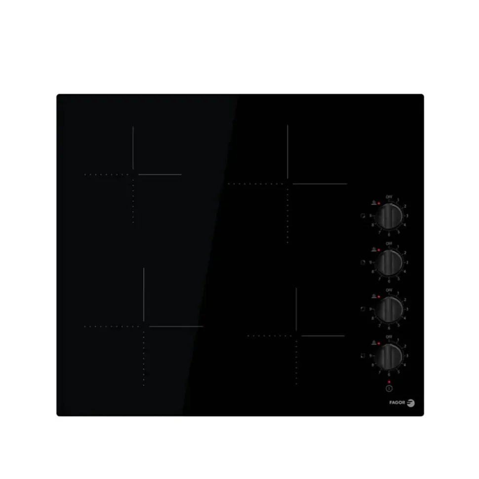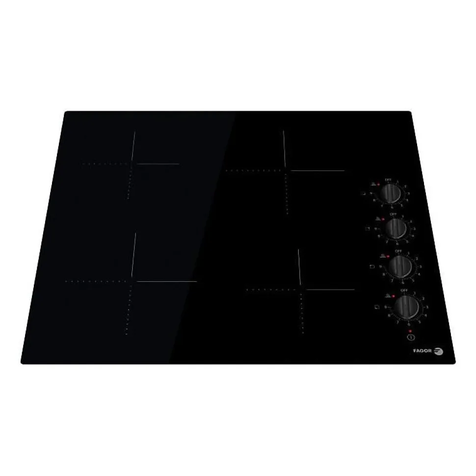 Table vitrocéramique Fagor FAVM3540 4 foyers noir encastrable 59×49 cm, 6000 W, commandes manettes à droite, 9 niveaux de puissance, voyants de chaleur résiduelle, câble d’alimentation inclus.