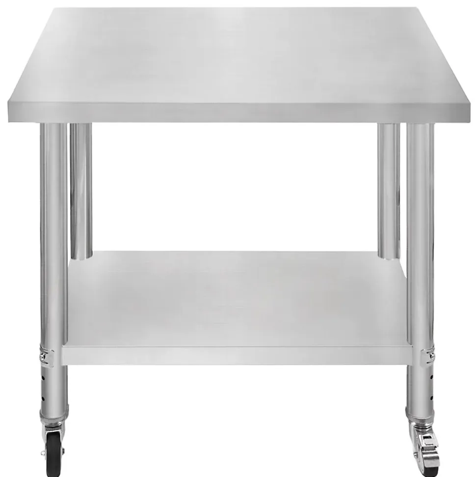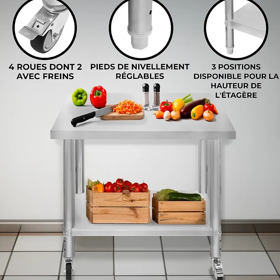 Améliorez la fonctionnalité de votre cuisine commerciale avec cette table de travail en inox de 76cm x 90cm x 86cm.Elle offre une surface robuste et spacieuse pour hacher, préparer et assembler – essentiel pour les établissements de restauration et de restauration très fréquentés.Fabriquée à partir d’acier inoxydable 201 de qualité supérieure, cette table offre une résistance et une durabilité exceptionnelles, ce qui lui permet de résister à une utilisation fréquente dans les cuisines commerciales exigeantes. La finition lisse facilite le nettoyage, parfait pour les environnements qui doivent maintenir un haut niveau d’hygiène alimentaire. Son aspect élégant et poli lui donne non seulement un aspect professionnel, mais se fondra également parfaitement dans les accessoires de cuisine environnants.Son étagère inférieure pratique offre une solution de rangement supplémentaire peu encombrante pour y stocker l’équipement et appareils de cuisine à portée de main. Bénéficiant de 3 positions de hauteur, chacune par incréments de 5cm, vous pouvez modifier l’unité en fonction des articles que vous choisissez de stocker. Le plateau et l’étagère inférieure offrent une capacité de poids remarquable de 80 kg, vous permettant de ranger facilement des objets lourds et d’effectuer des tâches en toute sécurité.Équipée de quatre roulettes, vous pouvez déplacer sans effort la table autour de votre espace de travail. Les roues offrent une maniabilité douce et facile, vous permettant de positionner la table là où c’est le plus pratique. De plus, avec deux freins, vous pouvez verrouiller la table en toute sécurité lors de son utilisation pour assurer une surface stable.De plus, la table est fournie avec 4 pieds ogives réglables, offrant encore plus de flexibilité. Les pieds et les roues interchangeables vous permettent de faire la transition de la table entre une utilisation mobile et stationnaire. La nature réglable des pieds non seulement
