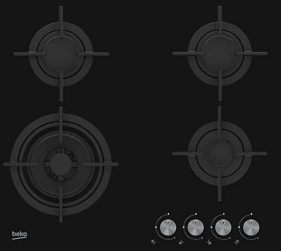 Table verre gaz 60cm 4 foyers noir Beko – Table verre gaz Beko HILW64222S dotée de 4 brûleurs dont 1 Wok double couronne 5 kW.Foyer Wok 5 kWLe foyer Wok de 5000 W double couronne est multifonction et particulièrement puissant. Il vous permet de saisir vite et de cuisiner en grand. Il offre d?excellentes performances de cuisson en un temps très court.Allumage intégréGrâce à l?allumage intégré, les brûleurs des foyers gaz se mettent en marche en un seul geste.Brûleurs haute efficacitéLe brûleur haute efficacité Beko permet une répartition parfaite de la chaleur, une cuisson plus rapide de 35%, plus efficace de 25% et plus économe de 17 % par rapport à un brûleur standard. – Type de produit : Table de cuisson gaz.Matière : verre trempé.Brûleur gaz : 4.Foyer(s) droit : AV -/1 _ AR -/1,75 cm/kW.Foyer(s) gauche : AV -/5 _ AR -/1,75 cm/kW.Injecteurs : équipée pour le gaz naturel. Livrée avec injecteurs butane/propane.Grilles : fonte.Bandeau : frontal.Commandes : manettes.Puissance de raccordement : 7800 W.Alimentation : 220-240 V / 50-60 Hz / 3 A.Connecté : non.Le + produit : Wok double couronne 5 kW.Allumage intégré aux manettes. Sécurité gaz par thermocouple. Grilles mono-foyer fonte.Cordon électrique : fourni (XXX cm) sans fiche.Coloris table : noir.Bordure : sans cadre.Dimensions Hors tout (LxHxP) : 59 x 4,6 x 52,2 cm.Dimensions Encastrement (LxHxP) : 56 x 4,6 x 48 cm.Poids net : 12,9 Kg.