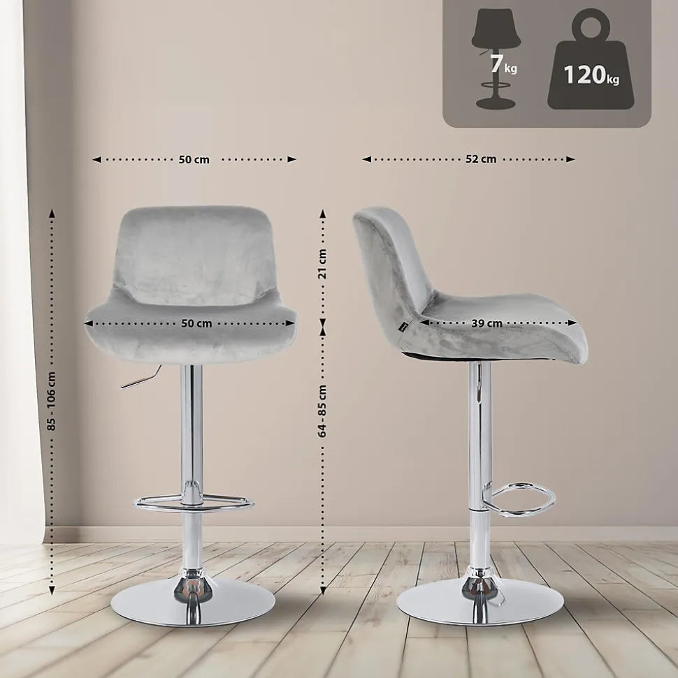 Tabouret de bar Solon en finition chroméeLe tabouret de bar Solon convainc par son design moderne et son grand confort d’assise. L’assise rembourrée est particulièrement confortable et le dossier soulage le bas du dos. Le repose-pieds apporte un confort supplémentaire. Le piètement métallique d’aspect chromé et le revêtement à la mode confèrent au tabouret une apparence élégante. L’assise est recouverte au d’un tissu résistant ou d’un velours chic. Le piètement métallique est réglable en hauteur et la fonction de rotation à 360 degrés assure une grande liberté de mouvement.Le piètement métallique stable offre une bonne stabilité et une capacité de charge jusqu’à 120 kg. L’anneau de protection du sol protège les sols fragiles.Détails:Largeur totale : 50 cmHauteur totale : 85 – 106 cmProfondeur totale : 52 cmHauteur d’assise : 64 – 85 cmSurface d’assise (l x p) : 50 x 39 cmHauteur du dossier : 21 cmMax. Capacité de charge : 120 kgPoids : 7 kgComposition du matériau : 100 % polyesterAssise:Revêtement : velours ou tissuAssise et dossier confortablement rembourrésAvec dossierPiétement:Matériau : Métal chroméRéglable en hauteur et pivotantAvec repose-pieds et anneau de protection pour le solConseils d’entretien:Essuyer les salissures légères avec un chiffon en coton humideNe passer l’aspirateur qu’avec un accessoire appropriéPour le nettoyage, nous recommandons un chiffon en coton humidifié à l’eau tiède