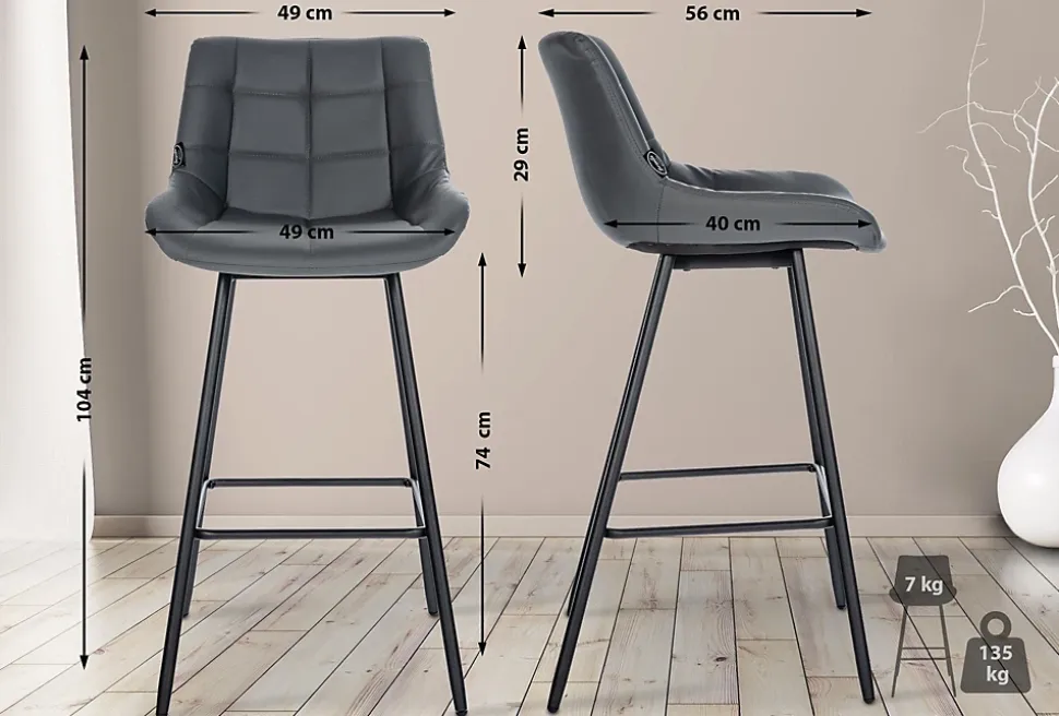 Tabouret de bar WestonLe tabouret de bar Weston incarne le style et la stabilité en parfaite harmonie. Doté d’un élégant motif piqué dans un revêtement en velours ou en similicuir, il attire l’attention sur chaque bar ou îlot de cuisine. Le rembourrage confortable, associé au dossier ergonomique, promet une expérience d’assise exceptionnellement confortable. Le piètement solide à quatre pieds assure la stabilité nécessaire et est équipé de protections pour le sol. Le repose-pieds intégré augmente encore le confort d’assise et fait du tabouret de bar Weston le choix idéal pour les longues heures de convivialité. Que ce soit pour une utilisation professionnelle ou à la maison, cette chaise de bar promet une longue durée de vie et séduit par ses propriétés faciles à entretenir.Composition des matériaux: 100% polyuréthane / 100% polyesterCa. Dimensions:Hauteur totale : 104 cmLargeur totale : 49 cmProfondeur totale : 56 cmAssise (LxP) : 49 x 40 cmHauteur d’assise : 74 cmHauteur du dossier : 29 cmLargeur du dossier : 49 cmMax. Capacité de charge : 135 kgPoids : 7 kgAssise:Revêtement avec coutures décoratives, velours ou similicuirPosition assise agréable grâce au dossierAssise confortablement rembourréeChâssis :Matériau : métal noirPiétement stable à quatre piedsStabilitéSpécificités :Un look moderne allié à un grand confortUne assise confortable même après plusieurs heuresUn revêtement facile d’entretienConseils d’entretien :Essuyer les salissures légères avec un chiffon en coton humideNe passer l’aspirateur sur les surfaces qu’avec un accessoire adaptéNe pas utiliser de produits ménagers