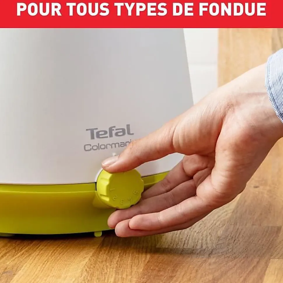 Partagez de délicieux moments de fondue avec jusqu’à 8 personnes grâce à la fondue Colormania de Tefal. Cet appareil à fondue dispose d’une paroi isolante et d’un caquelon antiadhésif avec thermostat réglable. Fabriqué en France, il est garanti 2 ans et consomme 800 Watt.