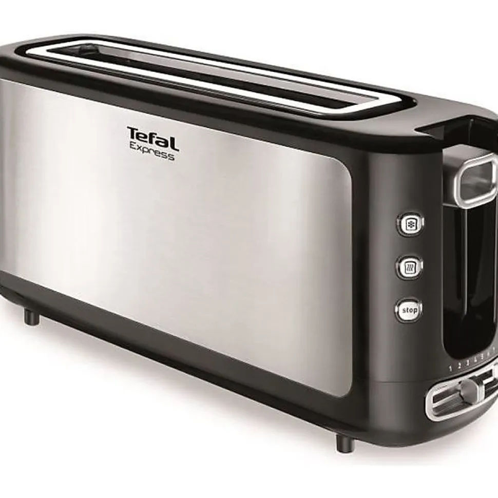 Grille-pain Tefal TL 365 ETR avec fonction décongélation et réchauffage, thermostat 7 positions, tiroir ramasse-miettes, puissance 1000 W, fente longue unique, conçu en inox et noir, parfait pour un petit-déjeuner rapide et personnalisé.