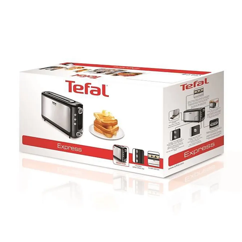 Le grille-pain TEFAL TL365ETR Express 1 fente est doté de 7 niveaux de dorage, de fonctions décongélation et réchauffage, d’une remontée extra-haute, d’un tiroir ramasse-miettes et d’un stop eject. Avec sa puissance de 1000W, il permet de griller rapidement toasts et tranches de baguettes. Sa longue chambre de grillage permet d’accueillir facilement les tranches de pain.