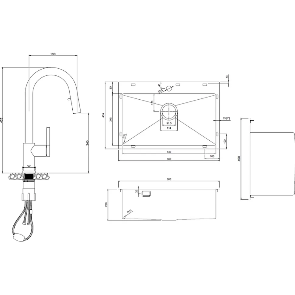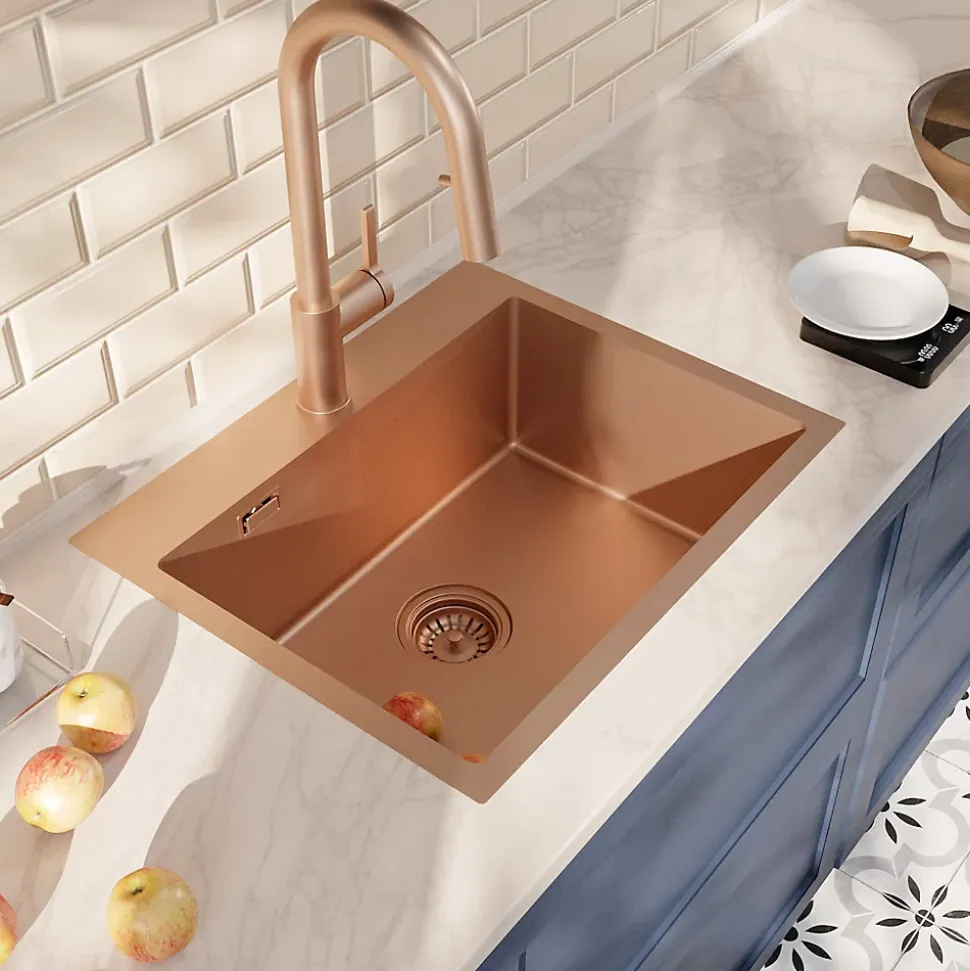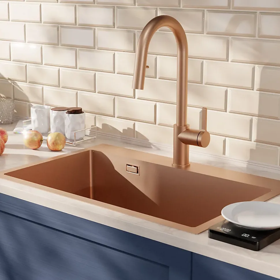 Caractéristiques de l’évier de cuisine encastrable 68x45x21 cm en inox 304, 1 bac + mitigeur d’évier à levier en acier inoxydable avec douchette extractible, monotrou, Ceramia Timeless, cuivre brossé (TMLKST-6845BCP-M2) :Ceramia Timeless Évier de cuisine encastrable inox 304, 1 bac, 68x45x21 cm, Cuivre brossé PVDCeramia Timeless mitigeur d’évier à levier en acier inoxydable avec douchette extractible, monotrou, cuivre brossé TML (TMLKF285BCP)Timeless Évier de cuisine encastrable inox 304, 1 bac, 68x45x21 cm, Cuivre brossé PVD :Matière: Acier inoxydable 304Coloris : Cuivre brossé PVDDimensions: 68x45x21 cmÉpaisseur : 1,5 mmType d’installation : À encastrerAvec trop pleinTrou percé pour robinetterieDiamètre de la bonde : 90mmLivré sans siphonTimeless mitigeur d’évier à levier en acier inoxydable avec douchette extractible, monotrou, cuivre brossé TML (TMLKF285BCP) :Type de produit : mitigeur de cuisine Marque : CeramiaSérie : TimelessMatière : Acier inoxydable 304SUSColoris : cuivreFinition : brossé TMLType de mitigeur : à levier unique Type d’installation : monotrou, à poserHauteur de meuble sous vasque conseillé : 42,2 cmTypes de jets : Douchette 2 fonctions en acier inoxydable :Jet pluie (spray)Jet concentré (stream)Cartouche en céramique de marque Sedal (Espagne) de haute qualité Testée pour plus de 500 000 cycles d’ouverture/fermetureTuyaux d’alimentation eau chaude/froide en PEX certifié qualité alimentaireTuyau extractible en PEX alimentaire pour une utilisation sécurisée et flexibleConnecteurs rapides en PEX alimentaireLivré dans une boîte blanche avec mousse de protection