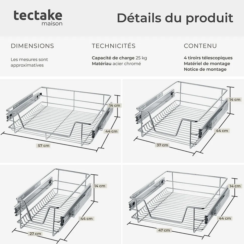 Tiroir de Rangement Télescopique en Métal, Panier Tiroir de Cuisine Coulissant – Armoire / Meuble TECTAKE. Ce tiroir de rangement télescopique polyvalent est parfait pour organiser ou ordonnancer votre cuisine, votre débarras, votre salle de bain, votre dressing ou votre placard de chambre à coucher. Ce produit très fonctionnel se décline en plusieurs tailles, il vous permet de créer des espaces de rangement astucieux et faciles d’accès. Fini la place perdue ! Il ne manquera pas de vous rendre votre quotidien plus agréable par son côté pratique.