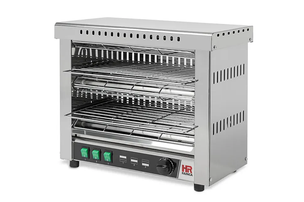 Toaster double Professionnel avec minuterie Toaster professionnel double – Avec minuteur – Puissance : 3 KW – Corps en acier inoxydable – Bac à miettes amovible-Résistance quartz– Grille amovible -Résistance protégées par grilles – Interrupteur pour chaque plante de résistances – Minuterie de 15 min – Dimension de cuisson 383x50x230