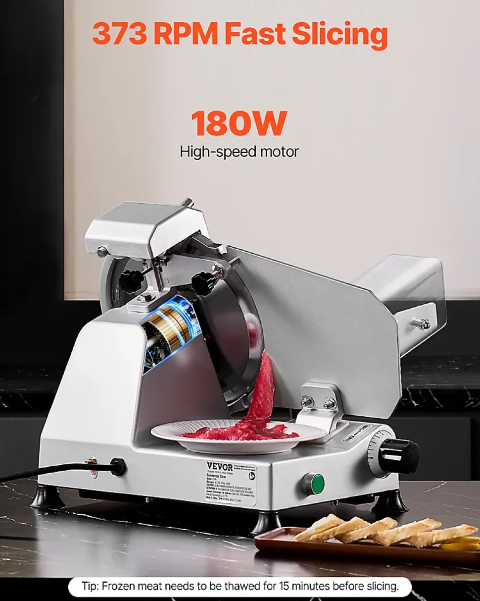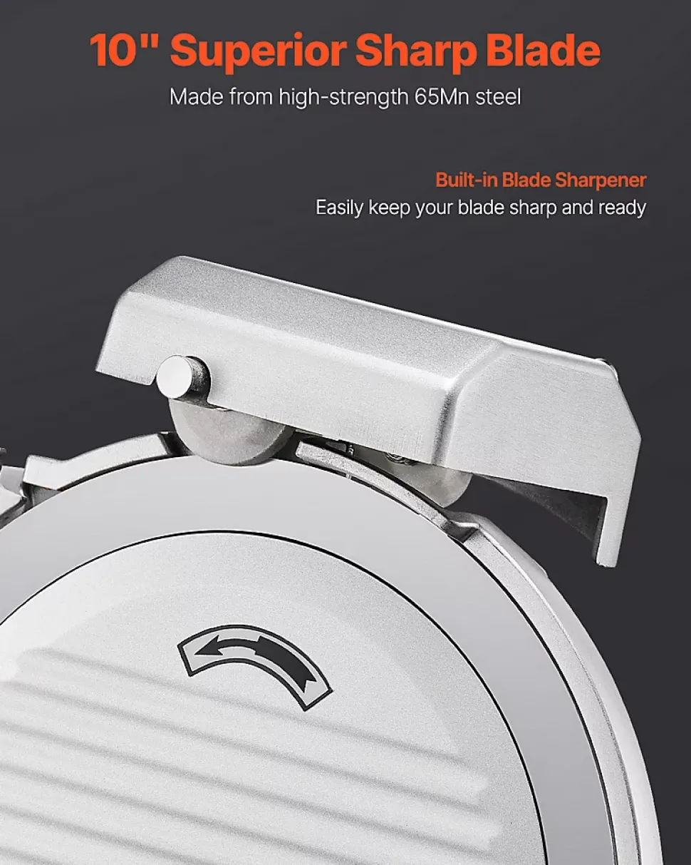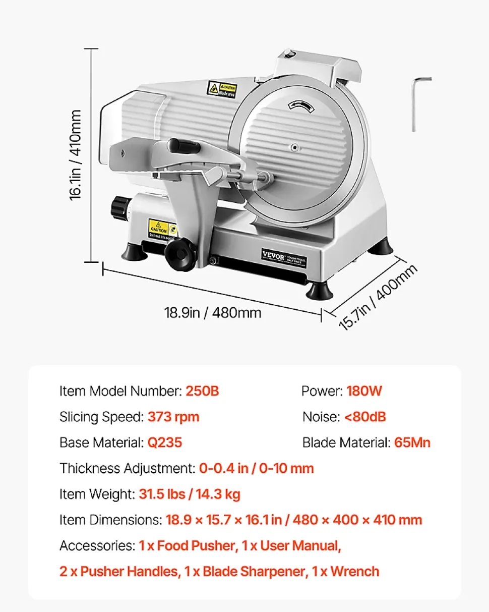 Présentation du produitTrancheuse à viande efficace de 25,4 cmRéalisez vos tâches de cuisine en un rien de temps grâce à notre puissante trancheuse à viande surgelée. Équipée d’un moteur de 180 W et d’une vitesse de rotation fluide de 373 tr/min, elle tranche sans effort les viandes, les fromages, le pain et les légumes. Dites adieu aux longs temps de préparation et bonjour aux tranches rapides, faciles et uniformes à chaque fois.SpécificationNuméro du modèle de l’article : 250BPuissance : 180 WVitesse de coupe : 373 tr/minBruit : Matériau de base : Q235Matériau de la lame : 65MnRéglage de l’épaisseur : 0-0,4 po / 0-10 mmPoids de l’article : 31,5 lb / 14,3 kgDimensions de l’article : 18,9 x 15,7 x 16,1 pouces / 480 x 400 x 410 mmContenu du coffret1 x trancheuse à viande1 x Poussoir à nourriture1 x Manuel d’utilisation2 x poignées de poussée1 x Aiguiseur de lame1 x cléCaractéristiques et détailsLame améliorée de 10 pouces : notre trancheuse à viande est équipée d’une lame améliorée de 10 pouces/25,4 cm plus large, permettant de traiter sans effort diverses textures d’aliments tels que la viande congelée, le fromage et le pain. Vous pouvez le garder affûté grâce à l’affûteur de lame intégré.Tranchage rapide : alimenté par un moteur de 180 W fonctionnant à 373 tr/min, couplé à une lame tranchante, notre trancheuse à viande électrique vous permet de trancher rapidement une variété d’ingrédients, améliorant considérablement votre efficacité au travailÉpaisseur réglable : la trancheuse à charcuterie est dotée d’un bouton de réglage de l’épaisseur avec une plage de 0 à 10 mm. Vous pouvez facilement personnaliser l’épaisseur pour répondre à vos besoins de préparation. Idéal pour faire des hamburgers, des sandwichs, de la charcuterie, des plateaux de fruits et plus encore