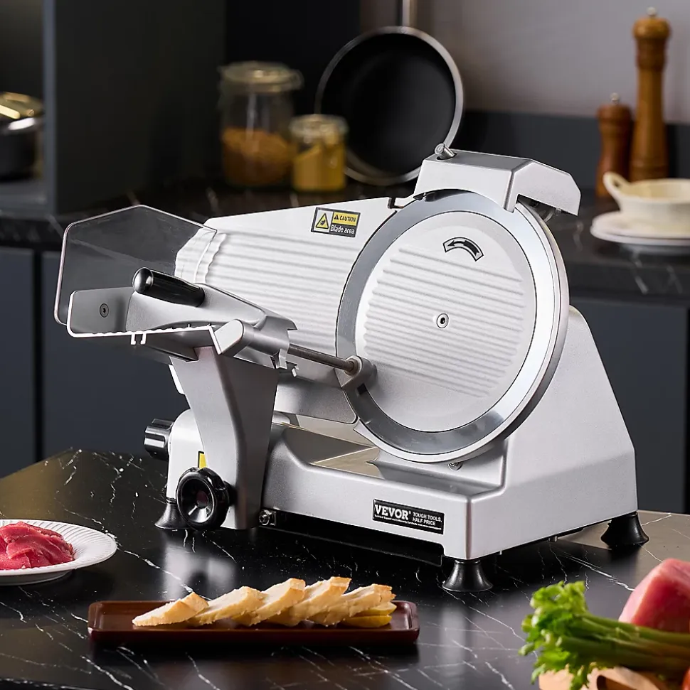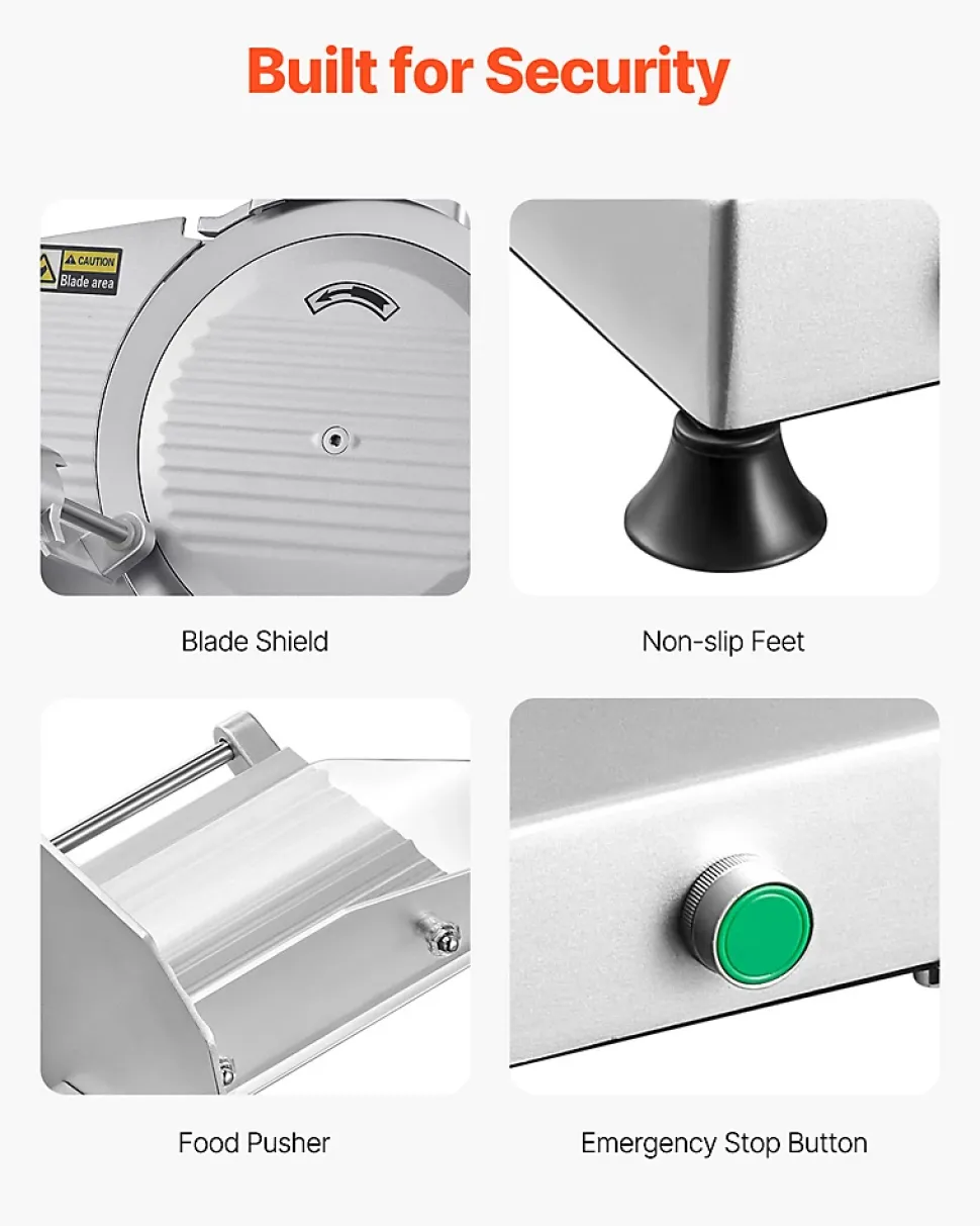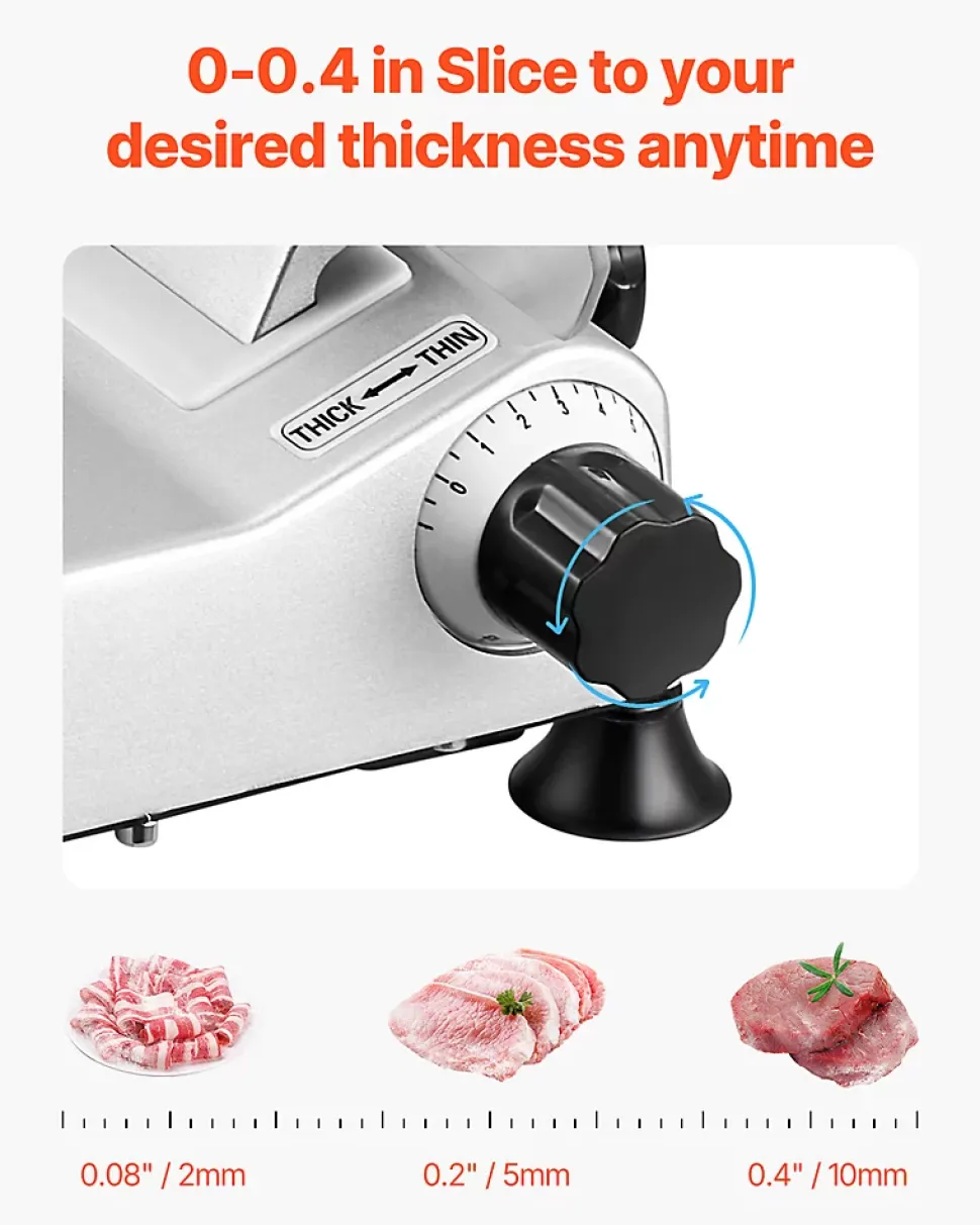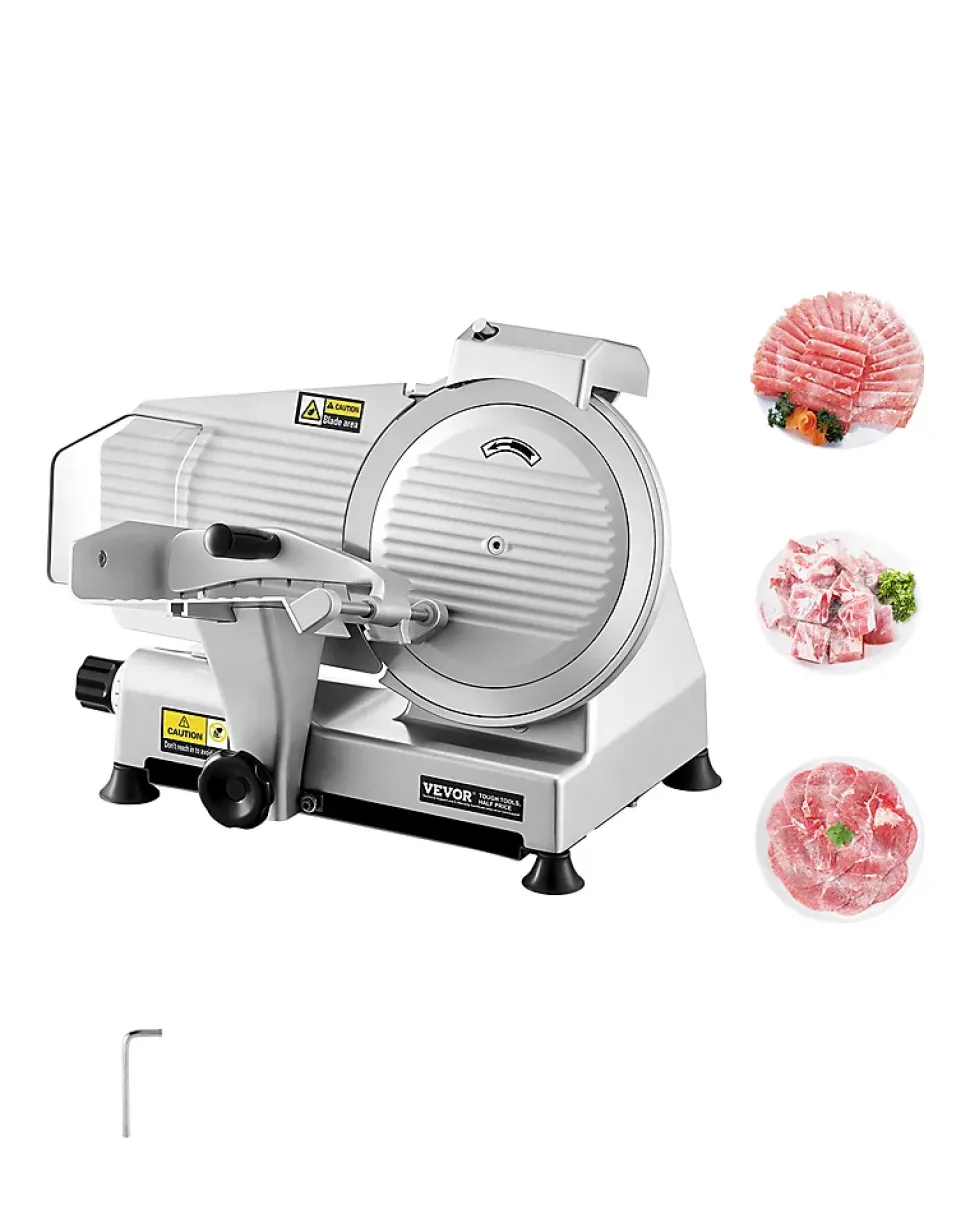 Présentation du produitTrancheuse à viande efficace de 25,4 cmRéalisez vos tâches de cuisine en un rien de temps grâce à notre puissante trancheuse à viande surgelée. Équipée d’un moteur de 180 W et d’une vitesse de rotation fluide de 373 tr/min, elle tranche sans effort les viandes, les fromages, le pain et les légumes. Dites adieu aux longs temps de préparation et bonjour aux tranches rapides, faciles et uniformes à chaque fois.SpécificationNuméro du modèle de l’article : 250BPuissance : 180 WVitesse de coupe : 373 tr/minBruit : Matériau de base : Q235Matériau de la lame : 65MnRéglage de l’épaisseur : 0-0,4 po / 0-10 mmPoids de l’article : 31,5 lb / 14,3 kgDimensions de l’article : 18,9 x 15,7 x 16,1 pouces / 480 x 400 x 410 mmContenu du coffret1 x trancheuse à viande1 x Poussoir à nourriture1 x Manuel d’utilisation2 x poignées de poussée1 x Aiguiseur de lame1 x cléCaractéristiques et détailsLame améliorée de 10 pouces : notre trancheuse à viande est équipée d’une lame améliorée de 10 pouces/25,4 cm plus large, permettant de traiter sans effort diverses textures d’aliments tels que la viande congelée, le fromage et le pain. Vous pouvez le garder affûté grâce à l’affûteur de lame intégré.Tranchage rapide : alimenté par un moteur de 180 W fonctionnant à 373 tr/min, couplé à une lame tranchante, notre trancheuse à viande électrique vous permet de trancher rapidement une variété d’ingrédients, améliorant considérablement votre efficacité au travailÉpaisseur réglable : la trancheuse à charcuterie est dotée d’un bouton de réglage de l’épaisseur avec une plage de 0 à 10 mm. Vous pouvez facilement personnaliser l’épaisseur pour répondre à vos besoins de préparation. Idéal pour faire des hamburgers, des sandwichs, de la charcuterie, des plateaux de fruits et plus encore