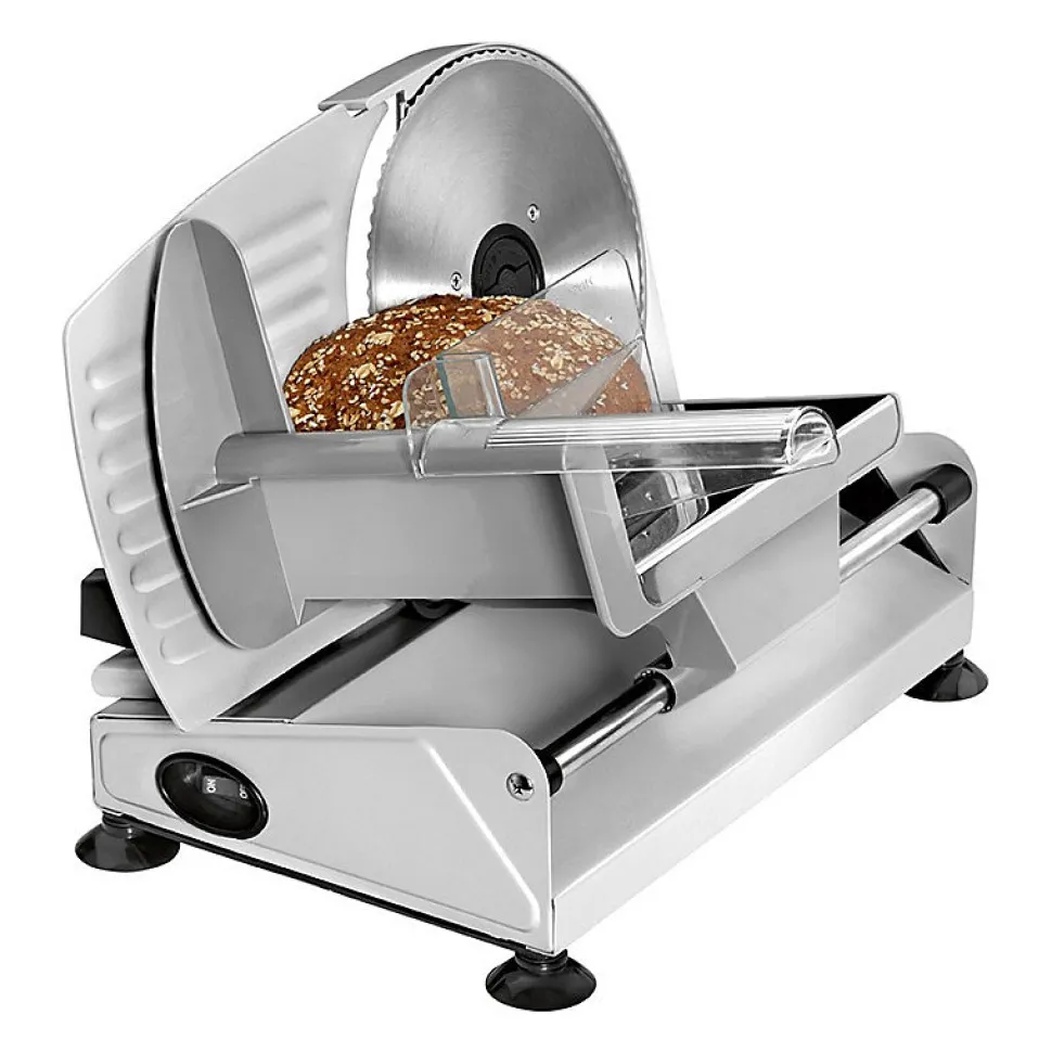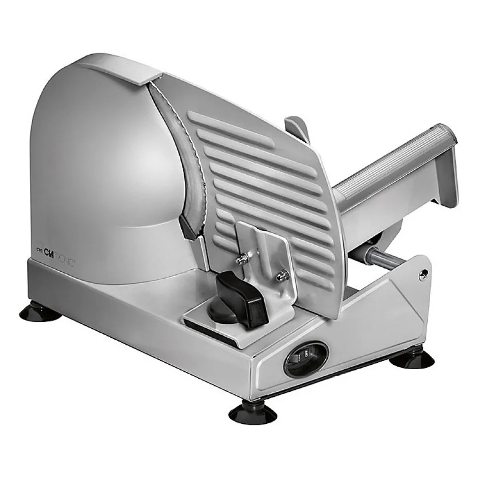 Grande lame en acier inoxydable (Ø 190 mm), antirouilleLame dentelée universelleBoîtier du moteur : aluminium moulé sous pressionInterrupteur marche/arrêtRail de guidage métalliquePlanche de guidage métalliquePoignée alimentaire avec protection des doigtsÉpaisseur de coupe réglable en continu (0-15 mm)Table d’appui inclinée avec insert en acier inoxydable,inclinable pour un nettoyage facileSupport sécurisé grâce aux pieds à ventouse220-240 V, 50/60 Hz, 150 W