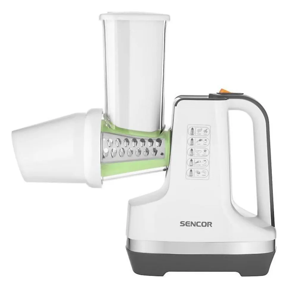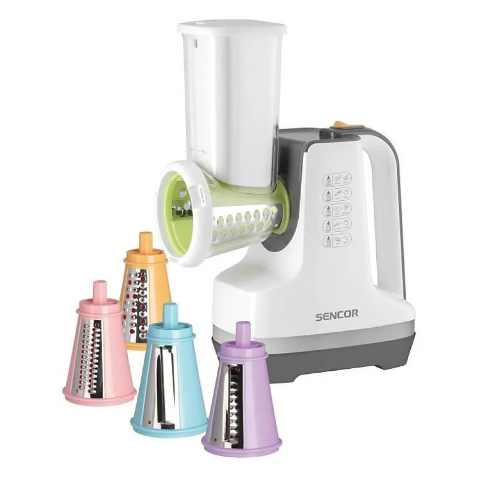 La trancheuse et râpe SENCOR SSG 4500WH allie polyvalence et praticité avec 6 fonctions en 1 grâce à ses accessoires interchangeables. Son tube d’alimentation large permet de travailler sans pré-découpe. La sorbetière intégrée prépare des desserts naturels rapidement. Le design compact avec pieds antidérapants garantit sécurité et facilité d’entretien. Puissance de 150 W avec fonctionnement silencieux.