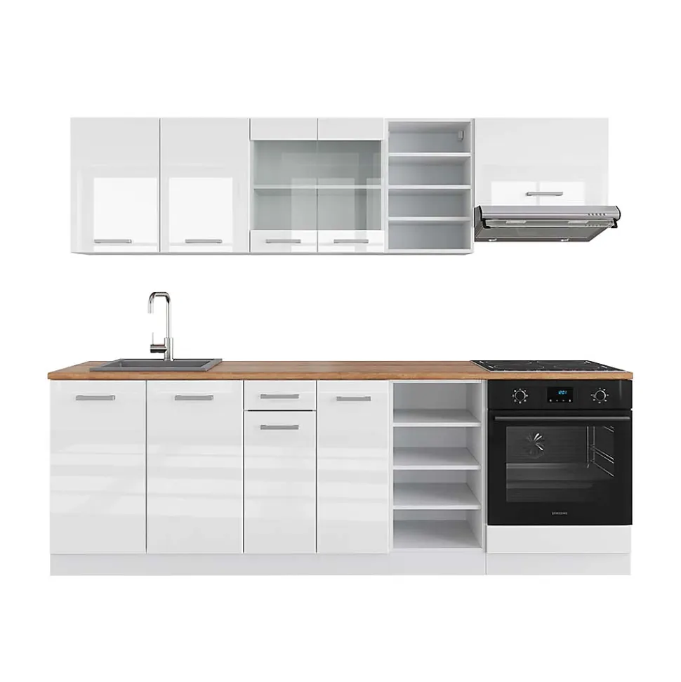 Les cuisines de la série R-Line se distinguent par un design optimal et une polyvalence universelle. En option, nous proposons également des panneaux de lave-vaisselle entièrement intégrés de la marque Vicco.La kitchenette offre la possibilité de personnaliser les modules selon vos besoins, avec la possibilité d’ajouter des modules supplémentaires si nécessaire. Les pieds peuvent être ajustés pour s’adapter à la hauteur de votre espace de vie.DIMENSIONS : Le Bloc de cuisine a une taille générale de 240 cm, la profondeur et la hauteur des modules inférieurs et supérieurs sont présentées sur les photos. Les meubles bas ont une profondeur de 46 cm.MATÉRIAU: La kitchenette modulaire est composée de panneaux de particules de 16 mm faciles à entretenir, avec un revêtement en résine mélamine.CONTENU DE LIVRAISON : bloc de cuisine avec plan de travail, matériel de montage, instructions de montage (sauf indication contraire, les appareils électroménagers et les décorations ne sont pas compris dans la livraison).