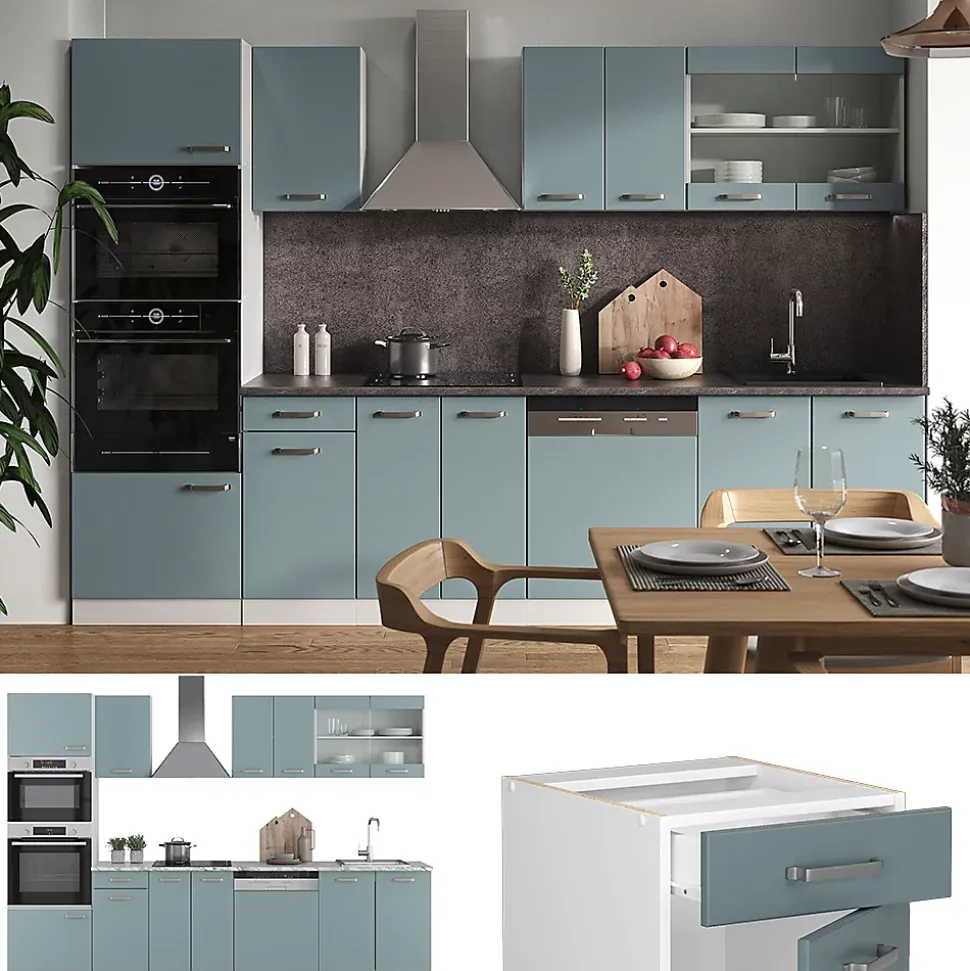 Les cuisines de la série R-Line se distinguent par un design optimal et une polyvalence universelle. En option, nous proposons également des panneaux de lave-vaisselle entièrement intégrés de la marque Vicco.La kitchenette offre des modules convertis selon les souhaits du client, avec la possibilité d’obtenir des modules supplémentaires au besoin. Les pieds sont ajustables pour une hauteur personnalisée.DIMENSIONS : Le Bloc de cuisine a une taille générale de 300 cm, la profondeur et la hauteur des modules inférieurs et supérieurs sont présentées sur les photos. Les meubles bas ont une profondeur de 46 cm.MATÉRIAU: La kitchenette modulaire est composée de panneaux de particules de 16 mm faciles à entretenir, avec un revêtement en résine mélamineCONTENU DE LIVRAISON : bloc de cuisine avec plan de travail, matériel de montage, instructions de montage (sauf indication contraire, les appareils électroménagers et les décorations ne sont pas compris dans la livraison).
