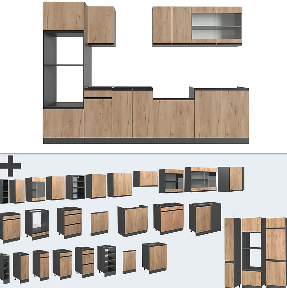 Les cuisines de la série R-Line se distinguent par un design optimal et une polyvalence universelle. En option, nous proposons également des panneaux de lave-vaisselle entièrement intégrés de la marque Vicco.La kitchenette offre des modules convertis selon les souhaits du client, avec la possibilité d’obtenir des modules supplémentaires au besoin. Les pieds sont ajustables pour une hauteur personnalisée.DIMENSIONS : Le Bloc de cuisine a une taille générale de 300 cm, la profondeur et la hauteur des modules inférieurs et supérieurs sont présentées sur les photos. Les meubles bas ont une profondeur de 46 cm.MATÉRIAU: La kitchenette modulaire est composée de panneaux de particules de 16 mm faciles à entretenir, avec un revêtement en résine mélamine.CONTENU DE LIVRAISON : bloc de cuisine avec plan de travail, matériel de montage, instructions de montage (sauf indication contraire, les appareils électroménagers et les décorations ne sont pas compris dans la livraison).