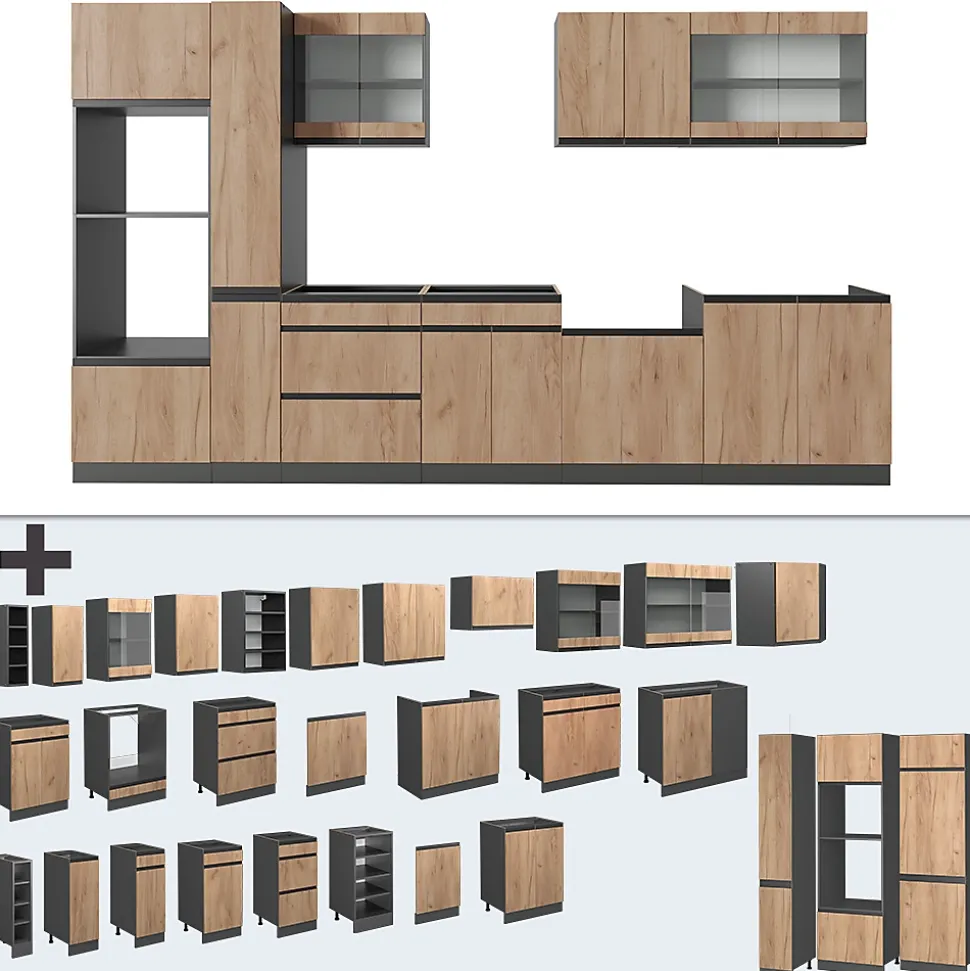 Les cuisines de la série R-Line se distinguent par un design optimal et une polyvalence exceptionnelle. En option, nous proposons le système LED Vicco ou une large gamme d’éviers Bergstroem.La kitchenette offre la possibilité de personnaliser les modules selon vos besoins, avec la possibilité d’ajouter des modules supplémentaires si nécessaire. Les pieds peuvent être ajustés pour s’adapter à la hauteur de votre espace de vie.DIMENSIONS : Le Bloc de cuisine a une taille générale de 350 cm, la profondeur et la hauteur des modules inférieurs et supérieurs sont présentées sur les photos.MATÉRIAU: La kitchenette modulaire est composée de panneaux de particules de 16 mm faciles à entretenir, avec un revêtement en résine mélamine.CONTENU DE LIVRAISON : Bloc cuisine sans plan de travail, matériel de montage, instructions de montage (sauf indication contraire, les appareils électroménagers et les décorations ne sont pas compris dans la livraison).
