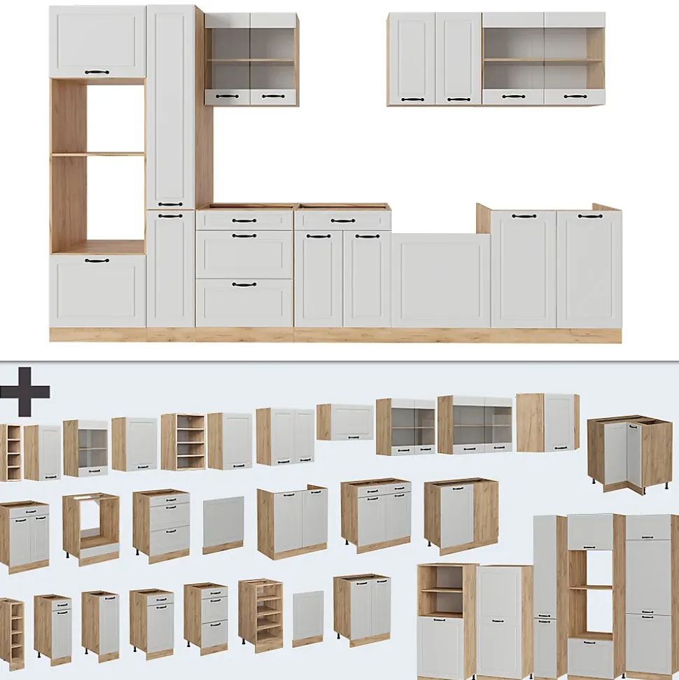 Les cuisines de la série R-Line se distinguent par un design optimal et une polyvalence exceptionnelle. En option, nous proposons le système LED Vicco ou une large gamme d’éviers Bergstroem.Le bloc de cuisine est modulaire et peut être adapté individuellement. Il est extensible et dispose de pieds réglables en hauteur.DIMENSIONS : la cuisine intégrée a une largeur de 350 cm, une hauteur de 206,8 cm et une profondeur de 60 cm. Toutes les dimensions détaillées sont indiquées sur les photos. Les meubles bas ont une profondeur de 46 cm.MATÉRIAU : la cuisine est en panneau de particules de 16 mm, facile à entretenir, avec un revêtement en mélamine.LIVRAISON : Coin cuisine en kit, 4 plans de travail, instructions de montage, matériel de montage.