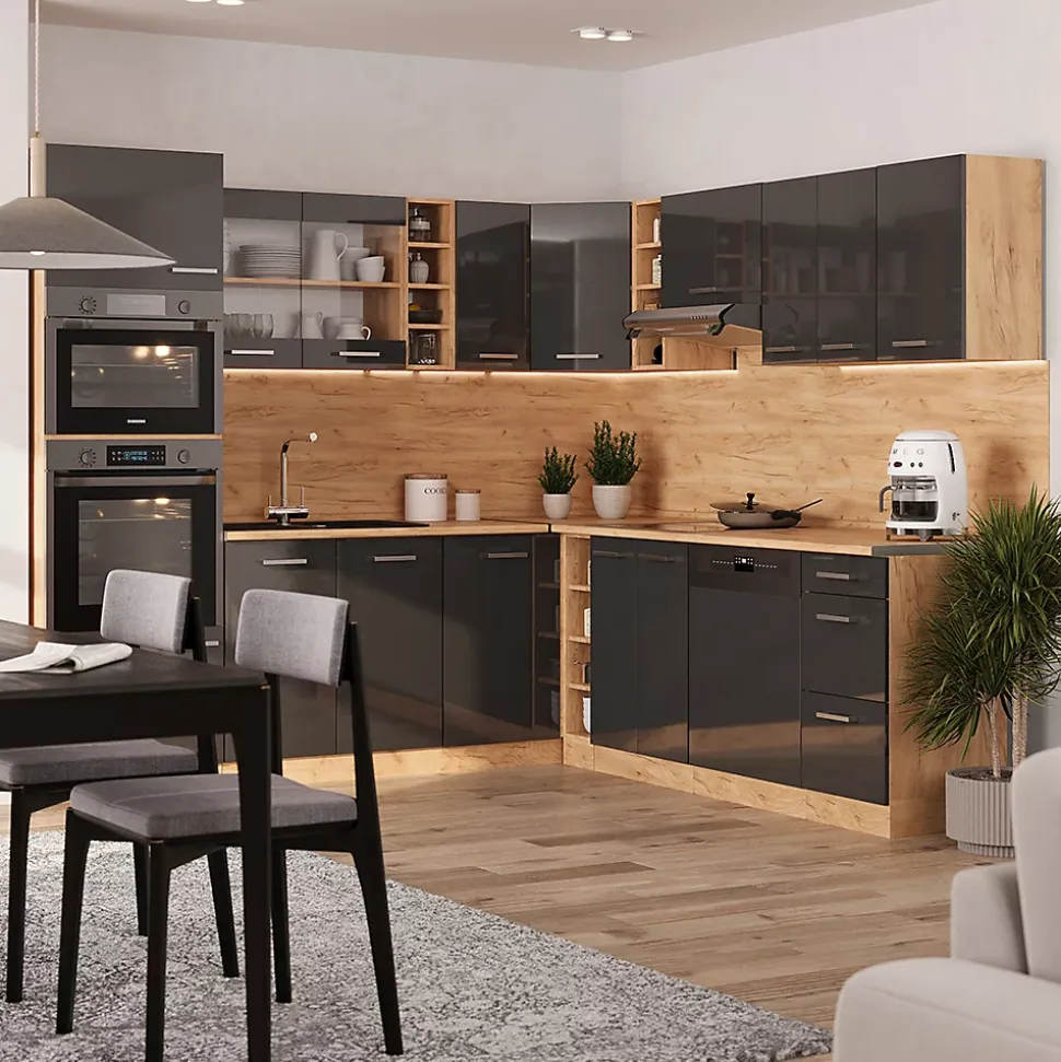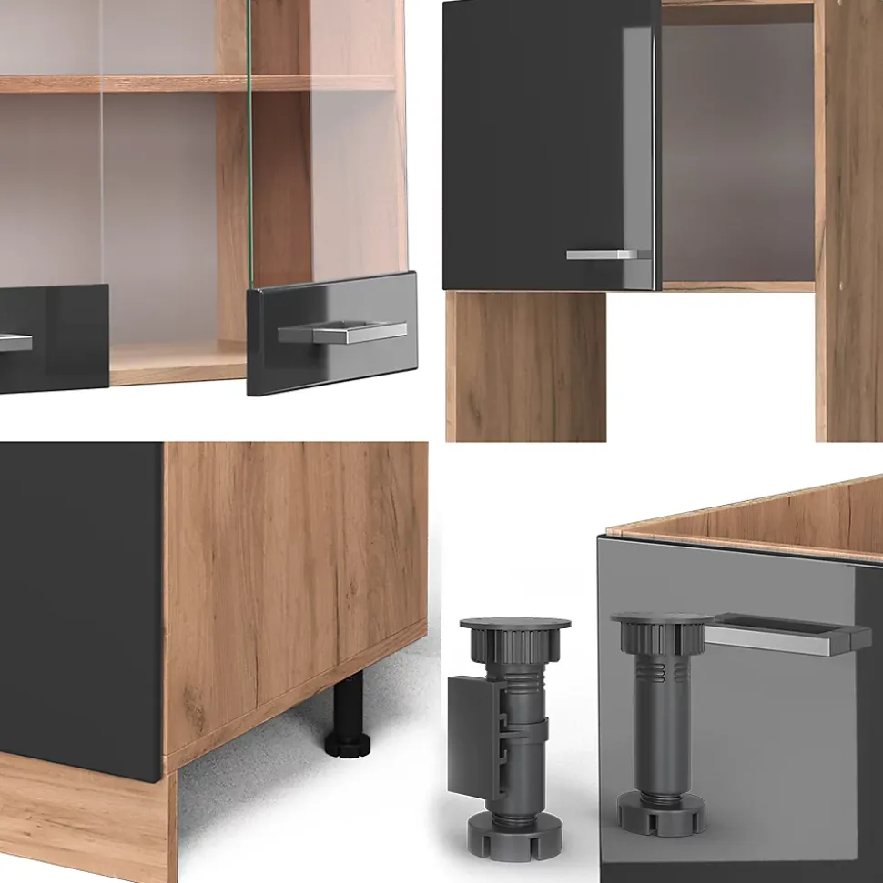 Les cuisines de la série R-Line se distinguent par un design optimal et une polyvalence universelle. En option, nous proposons également des panneaux de lave-vaisselle entièrement intégrés de la marque Vicco.Notre cuisine se compose de modules convertis à votre guise. Vous pouvez également obtenir des modules supplémentaires. Les pieds sont ajustables en hauteur pour un confort optimal.DIMENSIONS : La Cuisine en forme de L a une taille générale de 237×247 cm, la profondeur et la hauteur des modules inférieurs et supérieurs sont présentées sur les photos. Les meubles bas ont une profondeur de 46 cm.MATÉRIAU: La cuisine modulaire en angle est composée de panneaux de particules de 16 mm faciles à entretenir, avec un revêtement en résine mélamine.CONTENU DE LIVRAISON : bloc de cuisine avec plan de travail, matériel de montage, instructions de montage (sauf indication contraire, les appareils électroménagers et les décorations ne sont pas compris dans la livraison).