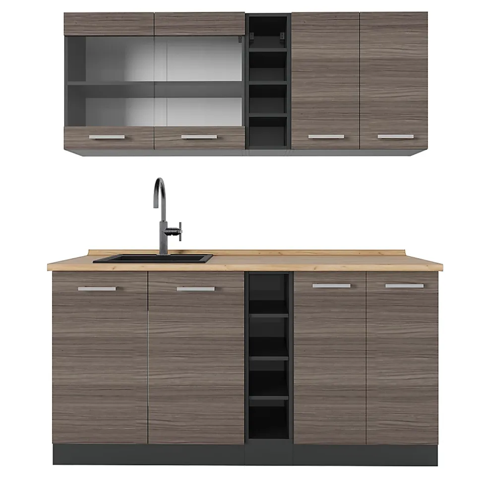 Les cuisines de la série R-Line se distinguent par un design optimal et une polyvalence universelle. En option, nous proposons également des panneaux de lave-vaisselle entièrement intégrés de la marque Vicco.La mini cuisine offre de nombreux avantages grâce à ses caractéristiques uniques. Les modules peuvent être convertis selon vos préférences et vous pouvez même obtenir des modules supplémentaires pour répondre à vos besoins spécifiques.DIMENSIONS : Le Bloc de cuisine a une taille générale de 160 cm, la profondeur et la hauteur des modules inférieurs et supérieurs sont présentées sur les photos. Les meubles bas ont une profondeur de 46 cm.MATÉRIAU: La kitchenette est composée de panneaux de particules de 16 mm faciles à entretenir, avec un revêtement en résine mélamine.CONTENU DE LIVRAISON : bloc de cuisine avec plan de travail, matériel de montage, instructions de montage (sauf indication contraire, les appareils électroménagers et les décorations ne sont pas compris dans la livraison).