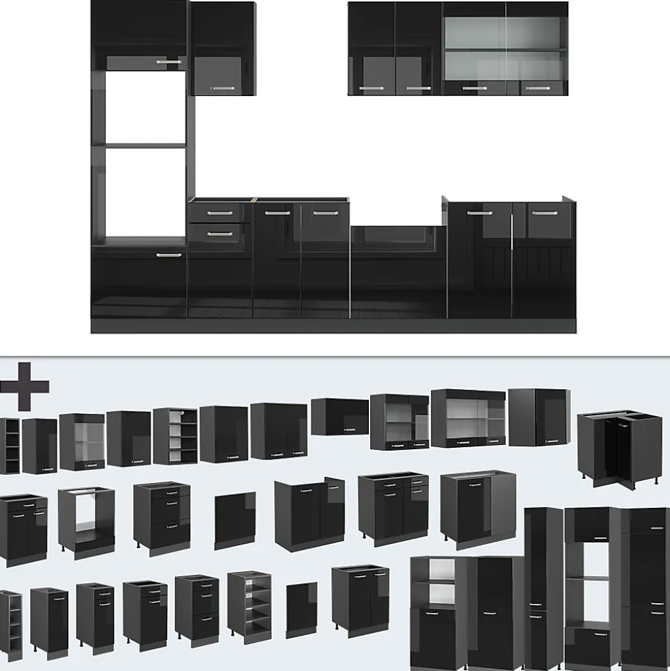 Vicco Cuisine Noir brillant/Anthracite 300cm avec armoire haute, PT Marbre