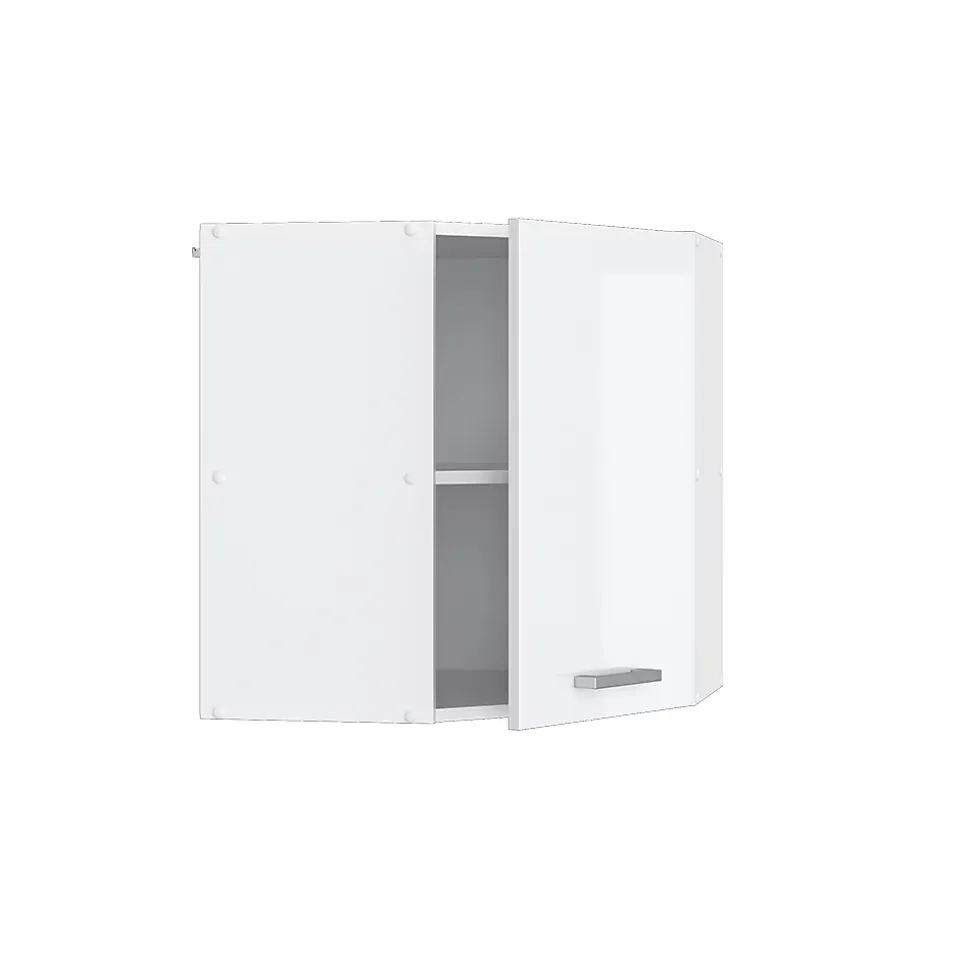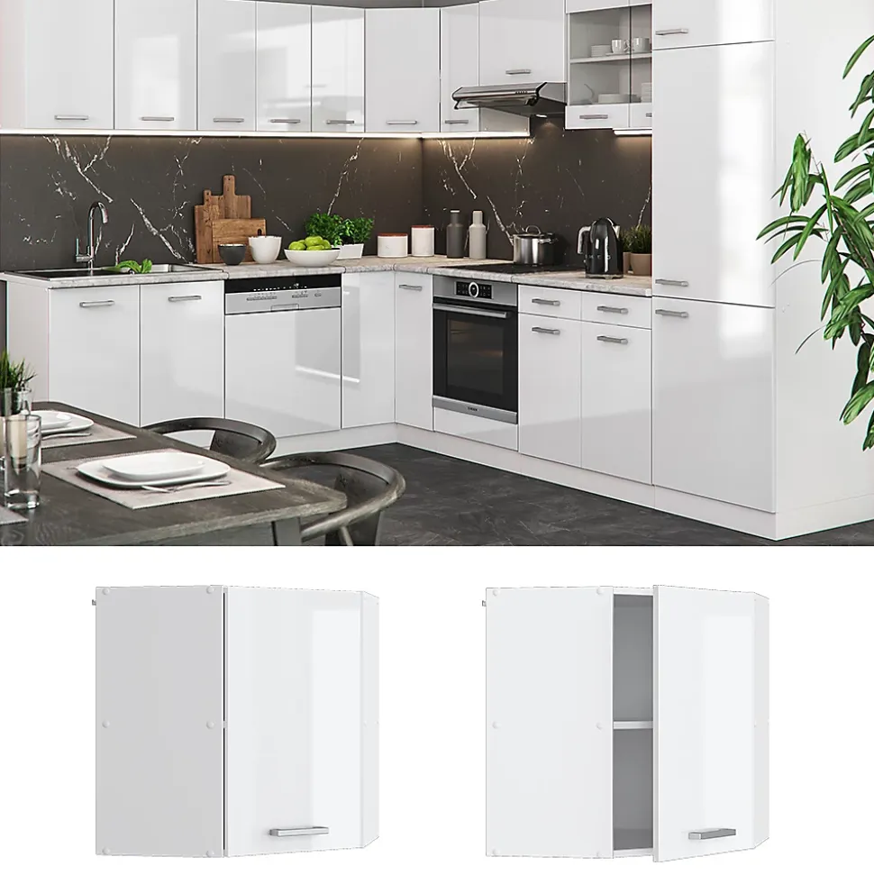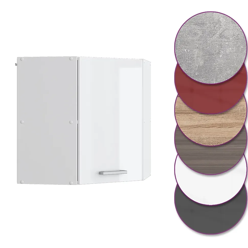 Le meuble de cuisine d’angle suspendu « R-Line » est idéal pour chaque maison grâce à sa conception optimale et son apparence agréable.Le meuble d’angle est parfait pour optimiser l’espace. Il possède une grande étagère intérieure et permet l’ajout de modules supplémentaires.DIMENSIONS : Le Meuble cuisine d’angle mesure 57×57 cm – Largeur, 60 cm – Hauteur, 34,1 cm – Profondeur. Toutes les tailles détaillées sont indiquées sur les photos.MATÉRIAU: L’armoire de cuisine d’angle murale est composée de panneaux de particules de 16 mm faciles à entretenir, avec un revêtement en résine mélamine.CONTENU DE LA LIVRAISON: Meuble haut d’angle à monter soi-même (Remarque: la décoration n’est pas incluse dans la livraison), Instructions de montage, Matériel de montage.