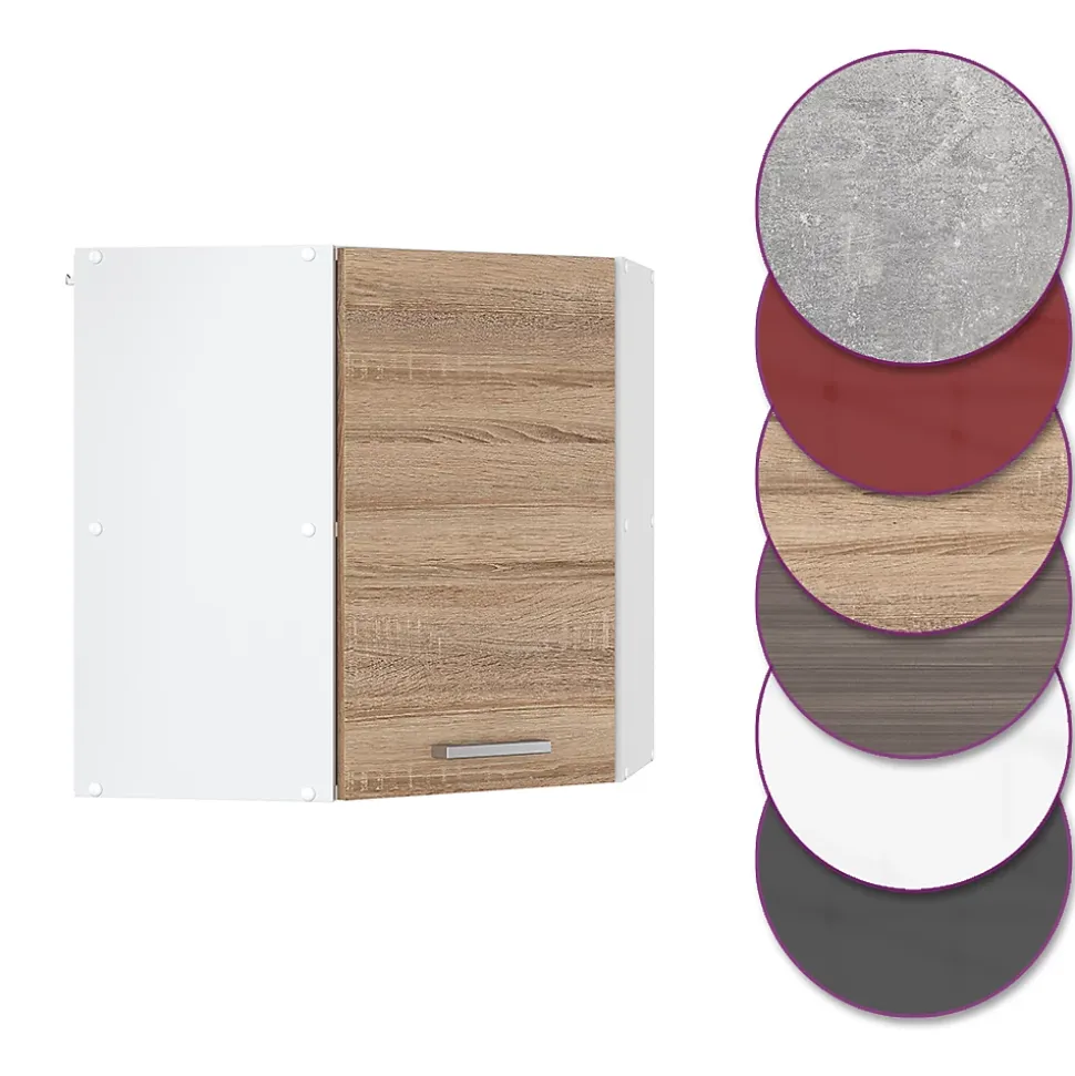 Le meuble de cuisine d’angle suspendu « R-Line » est idéal pour chaque maison grâce à sa conception optimale et son apparence agréable.Le meuble d’angle est parfait pour optimiser l’espace. Il possède une grande étagère intérieure et permet l’ajout de modules supplémentaires.DIMENSIONS : Le Meuble cuisine d’angle mesure 57×57 cm – Largeur, 60 cm – Hauteur, 34,1 cm – Profondeur. Toutes les tailles détaillées sont indiquées sur les photos.MATÉRIAU: L’armoire de cuisine d’angle murale est composée de panneaux de particules de 16 mm faciles à entretenir, avec un revêtement en résine mélamine.CONTENU DE LA LIVRAISON: Meuble haut d’angle à monter soi-même (Remarque: la décoration n’est pas incluse dans la livraison), Instructions de montage, Matériel de montage.