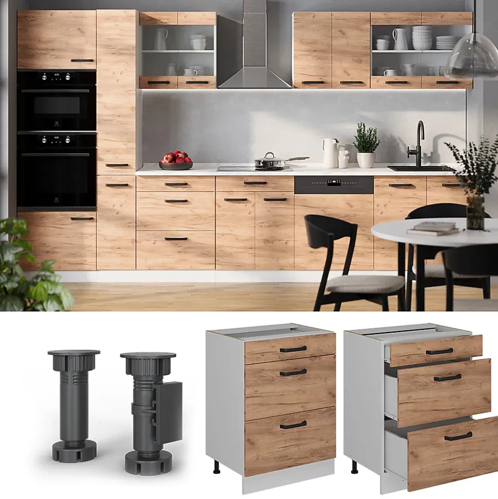 L’armoire basse de cuisine « R-Line » est un choix parfait pour chaque maison. Sa bonne conception et son design optimal offrent un aspect agréable à tout intérieur. Sa polyvalence en fait un produit universel qui convient à tout type de cuisine.Modules flexibles pour un agencement personnalisé de votre élément bas de cuisine, avec la possibilité d’ajouter des modules supplémentaires selon vos besoins. Hauteur ajustable grâce à des pieds réglables.DIMENSIONS : Le Meuble bas de cuisine avec tiroirs mesure 46 cm – Largeur, 81,6 cm – Hauteur, 46 cm – Profondeur. Toutes les tailles détaillées sont indiquées sur les photos.MATÉRIAU: Le meuble bas de cuisine est composé de panneaux de particules de 16 mm faciles à entretenir, avec un revêtement en résine mélamine.CONTENU DE LA LIVRAISON: Meuble bas de cuisine en kit (Remarque: la décoration n’est pas incluse dans la livraison), Instructions de montage, Matériel de montage