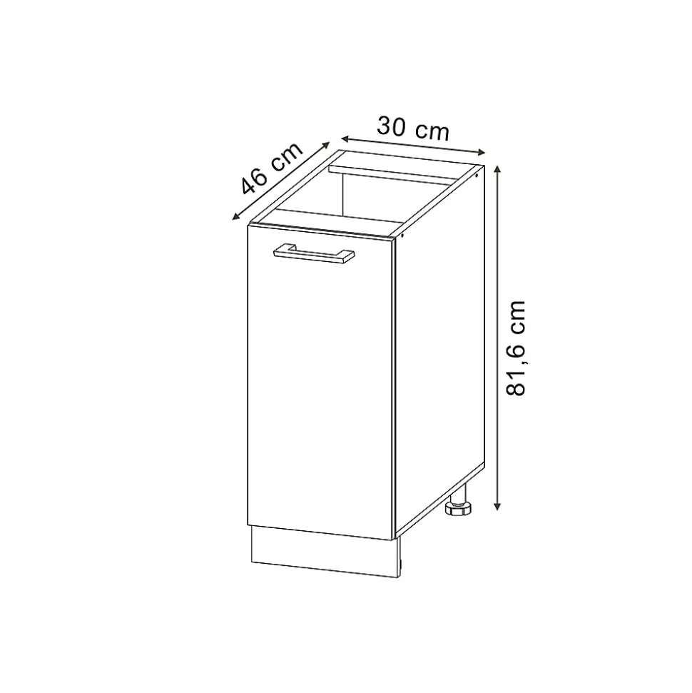 L’armoire de cuisine « R-Line » est le choix parfait pour votre maison. Son design optimal et son aspect agréable s’adaptent à tous les intérieurs. Profitez d’une utilisation facile et plaisante grâce à sa conception bien pensée.Les éléments bas de cuisine offrent une grande flexibilité avec des modules convertibles et supplémentaires disponibles. La hauteur des pieds ajustables ajoute encore plus de versatilité.DIMENSIONS : Le meuble bas de cuisine mesure 30 cm – Largeur, 81,6 cm – Hauteur, 46 cm – Profondeur. Toutes les tailles détaillées sont indiquées sur les photos.MATÉRIAU: Le mobilier de cuisine est composé de panneaux de particules de 16 mm faciles à entretenir, avec un revêtement en résine mélamine.CONTENU DE LA LIVRAISON: Meuble bas de cuisine en kit (Remarque: la décoration n’est pas incluse dans la livraison), Instructions de montage, Matériel de montage.