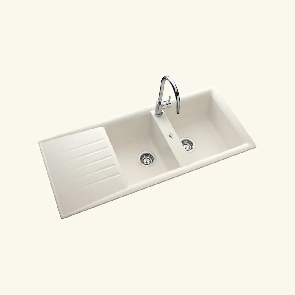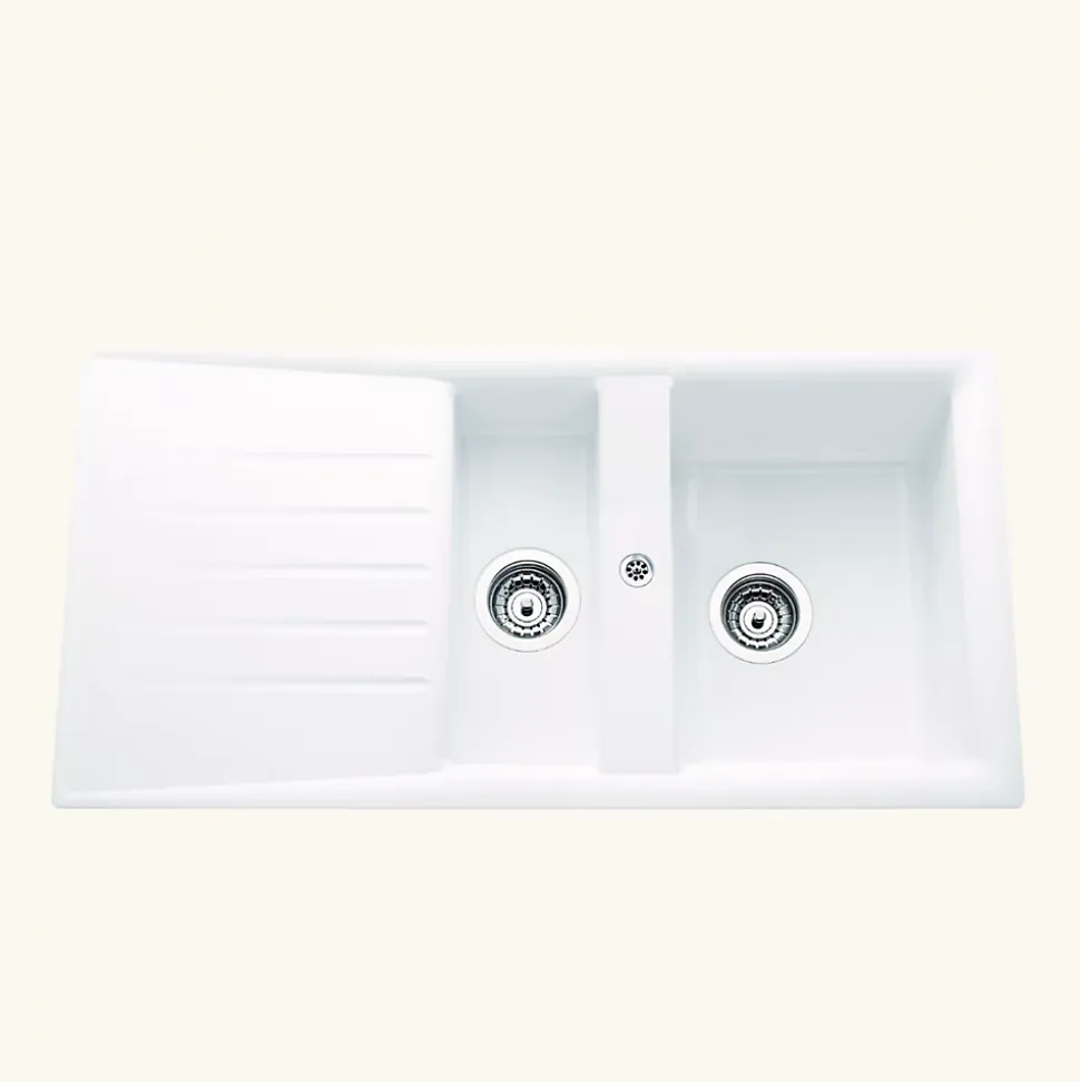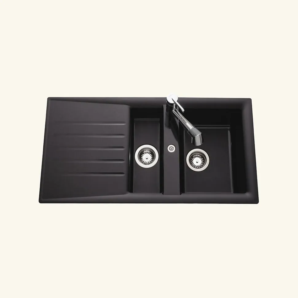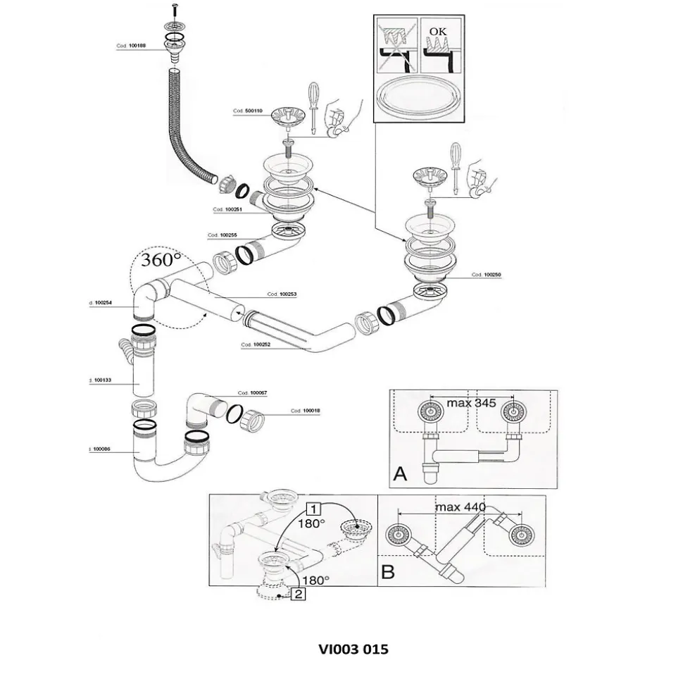 <p•• Pour évier résine et granit •• Avec trop plein horizontal•• 2 bondes 90 cm •• Vidage manuel