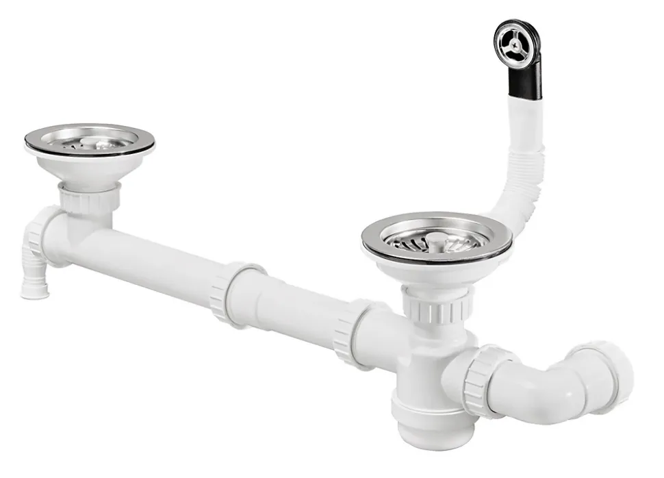 Vidage manuel évier 1 cuve Ø90mm avec trop plein rond Ø28mm, bonde à panier chromée, tube de trop plein extensible L325mm maxi, évacuation pour tuyau Ø40mm et prise machine à laver