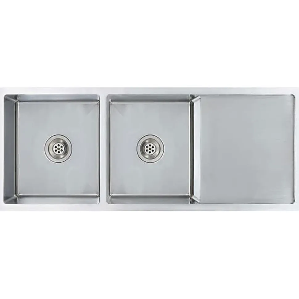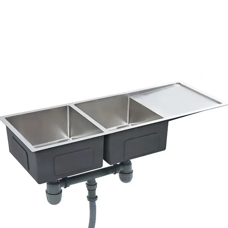 Évier haut de gamme au design contemporain épuré. Conçu en acier inoxydable fait main de haute qualité avec finition brossée. Offre une résistance à la corrosion, aux rayures, aux taches, à la moisissure et à la condensation. Dispose d’une conception double vasque extra-profonde avec un design à canal en X pour une vidange rapide et un égouttoir pratique. Insonorisé avec tampons d’insonorisation. Montage possible sous plan, encastré ou suspendu.