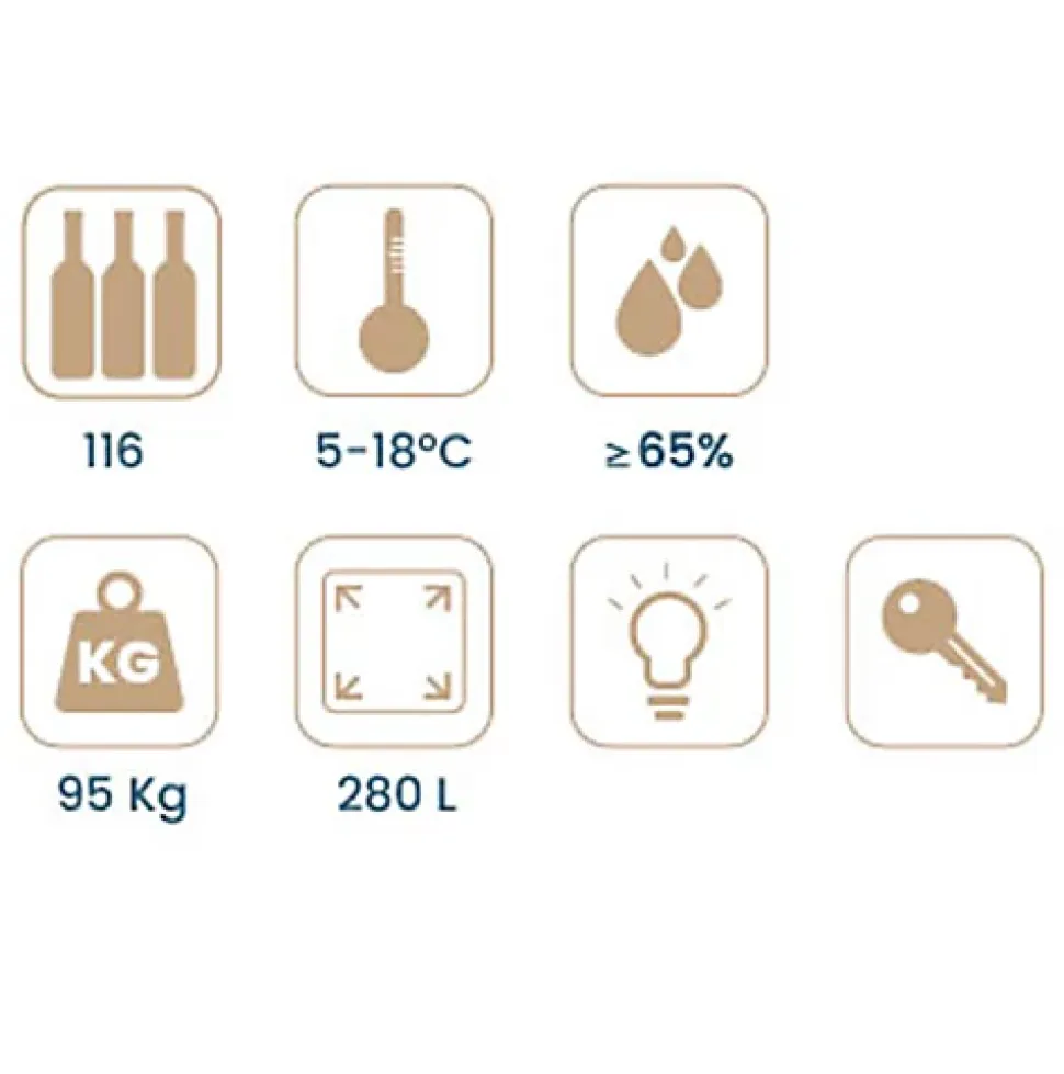 La cave à vin Vinobox 110 1 zone est une chambre de service pour de moyennes à grandes quantités de vin en garde. Parfait pour les professionnels, de par sa grande capacité et sa fiabilité, et pour les grands amateurs de vin qui souhaitent conserver leurs vins dans les meilleures conditions. 59,5 cm de largeur sur 136cm de hauteur et 68cm de profondeur.
