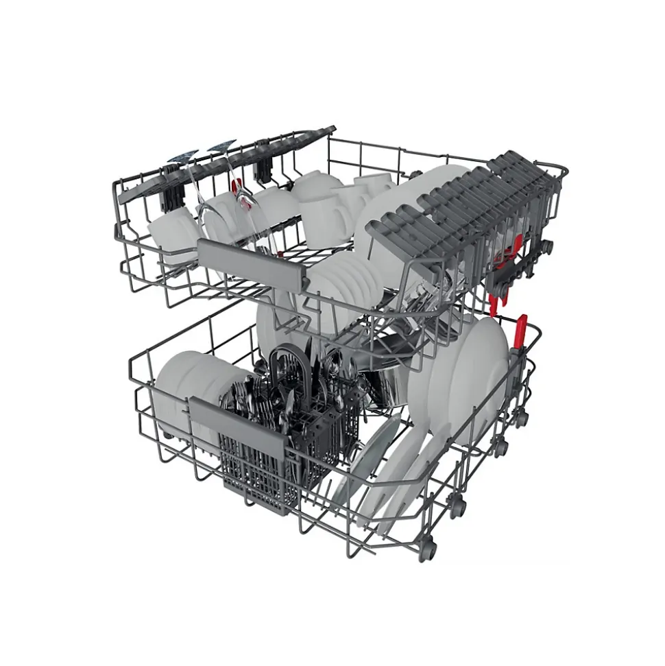 Lave-vaisselle Tout intégrable – 8 programmes dont Silence 42 dB et 6ème Sens Auto 50-60°C – Options Tablettes, MultiZone et PowerClean Pro : 20 jets haute pression en fond de cuve pour éliminer les salissures les plus résistantes et gagner 30% d’espace de rangement supplémentaire dans le panier inférieur – La technologie 6ème Sens adapte automatiquement la durée du cycle, la température et la quantité d’eau nécessaire pour un lavage impeccable – Natural Dry : système d’ouverture automatique de la porte en fin de cycle pour un séchage naturel, optimal et économique (+70% d’amélioration de séchage) – Panier supérieur réglable en hauteur – Moteur induction – Départ différé jusqu’à 12 heures – Light On Floor : indicateur lumineux de fonctionnement au sol. Cet appareil est intégrable. Il est livré sans habillage ni porte décorative, afin de vous permettre de l’assortir au mobilier et à la couleur de votre cuisine. Nombre de couverts 14Niveau sonore 43 dBConso élec. 85 kWh / 100 cyclesConso eau 9,5 L / cycle de référenceDurée Prog. ECO 210 minLabels et points clésLabel énergie DCatégorie sonore BIndice de réparabilité 7,8 / 10Le + produit Options Tablettes, MultiZone et PowerClean ProDisponibilité des pièces détachées 10 ans (donnée constructeur)Voyant de rinçage ouiVoyant de sel ouiDépart différé jusqu’à 12 heuresAfficheur Temps Restant nonConnecté nonMatériau de la cuve inoxTiroir à couverts nonPorte à glissières nonOuv. porte auto Fin de cycle ouiHauteur XXL nonDimensions Encastrement (LxHxP) 60 x 82/90 x 56 cmPoids net 35,5 KgLieu de fabrication Pologne