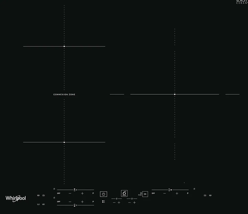 - Plaque à induction Whirlpool 59 cm avec 3 foyers dont une zone ConneXion de 30 cm pour grands récipients, 3 boosters (max 3,6 kW) et 9 niveaux de puissance.