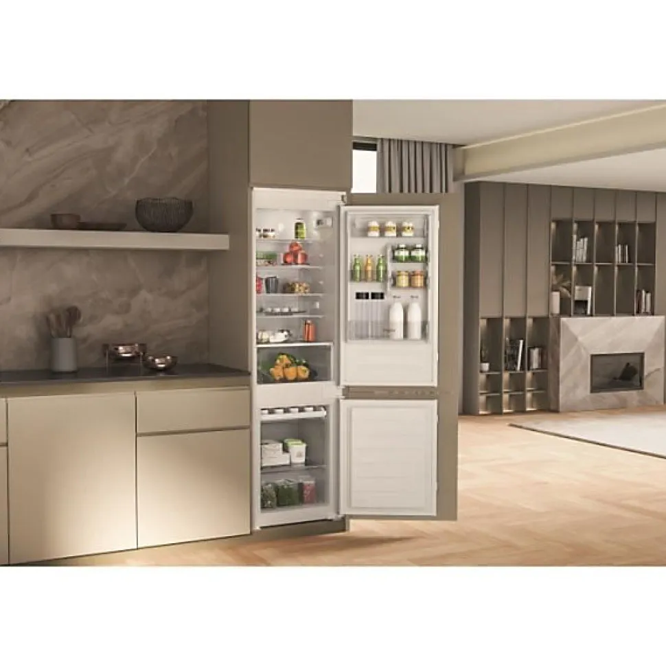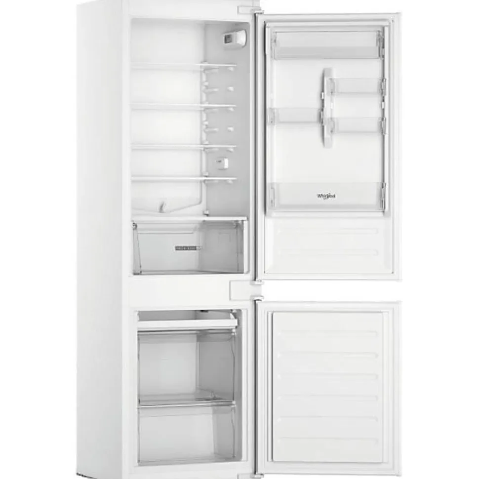 Réfrigérateur combiné intégrable à glissières 268l Whirlpool – Réfrigérateur combiné WHC18D071A1FR de WhirlpoolRéfrigérateur combiné encastrable WHC18D071A1FR : performance et design pour une conservation optimale ! Ce réfrigérateur offre une conservation optimale grâce à son ventilateur intégré, qui assure une répartition homogène de l’air et maintient une température stable dans toute la cavité. Résultat : des aliments frais plus longtemps. La technologie Stop Frost simplifie le dégivrage : il suffit de retirer le collecteur de givre et de le passer sous l’eau en seulement une minute pour un entretien rapide et sans effort. Avec la fonction 6ème Sens FreezeControl, ce modèle ajuste précisément la température, préservant la qualité et les propriétés de vos aliments sur une durée prolongée. Gardez vos fruits et légumes frais jusqu’à 15 jours grâce à la Fresh Box+, équipée d’un curseur permettant de régler l’humidité selon vos besoins. Profitez d’un rangement optimisé avec le système Space Management, qui offre un espace généreux pour stocker vos aliments et boissons tout en préservant un agencement ordonné. Enfin, le compresseur inverter ultra-silencieux, avec un niveau sonore de seulement 34 dB, assure un confort acoustique optimal. Ce réfrigérateur combiné est ainsi un allié discret et performant, parfait pour compléter une cuisine au style moderne et épuré. – Type de produit : Réfrigérateur combiné.Type d’installation : Encastrable.Consommation d’énergie (kWh/an) : 227.Consommation d’énergie (kWh/24 h) : 0.62.WHC18D071A1FR Classe d’efficacité énergétique : E.Niveau sonore dB(A) : 34.Volume utile total (en litres) : 268.Glissières Invisibles : Oui.Thermostat : Electronique.Type de gaz : R600A.Classe climatique : SN-T.Portes réversibles : Oui.Volume utile de réfrigerateur (en litres) : 189.Froid Brassé : Non.6ème Sens Control : Oui.Eclairage intérieur LED : Oui.Clayettes verre