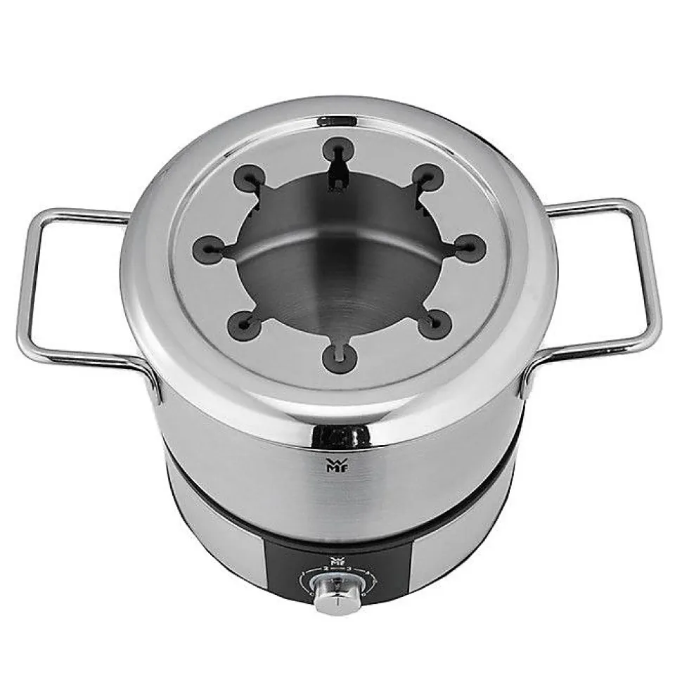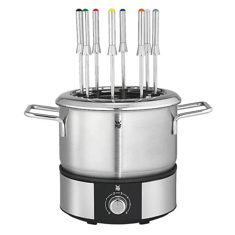 Cet appareil à fondue WMF LONO, avec son caquelon d’1,2 L et ses 8 fourchettes en acier inoxydable Cromargan est l’idéal pour une soirée conviviale et festive. Elégant et décoratif il possède des fourchettes marquées chacune d’une couleur différente qui ont leur propre emplacement dans le caquelon. Le régulateur de température et la puissance de 1400 watts permettent à l’huile ou au bouillon de chauffer rapidemen…
