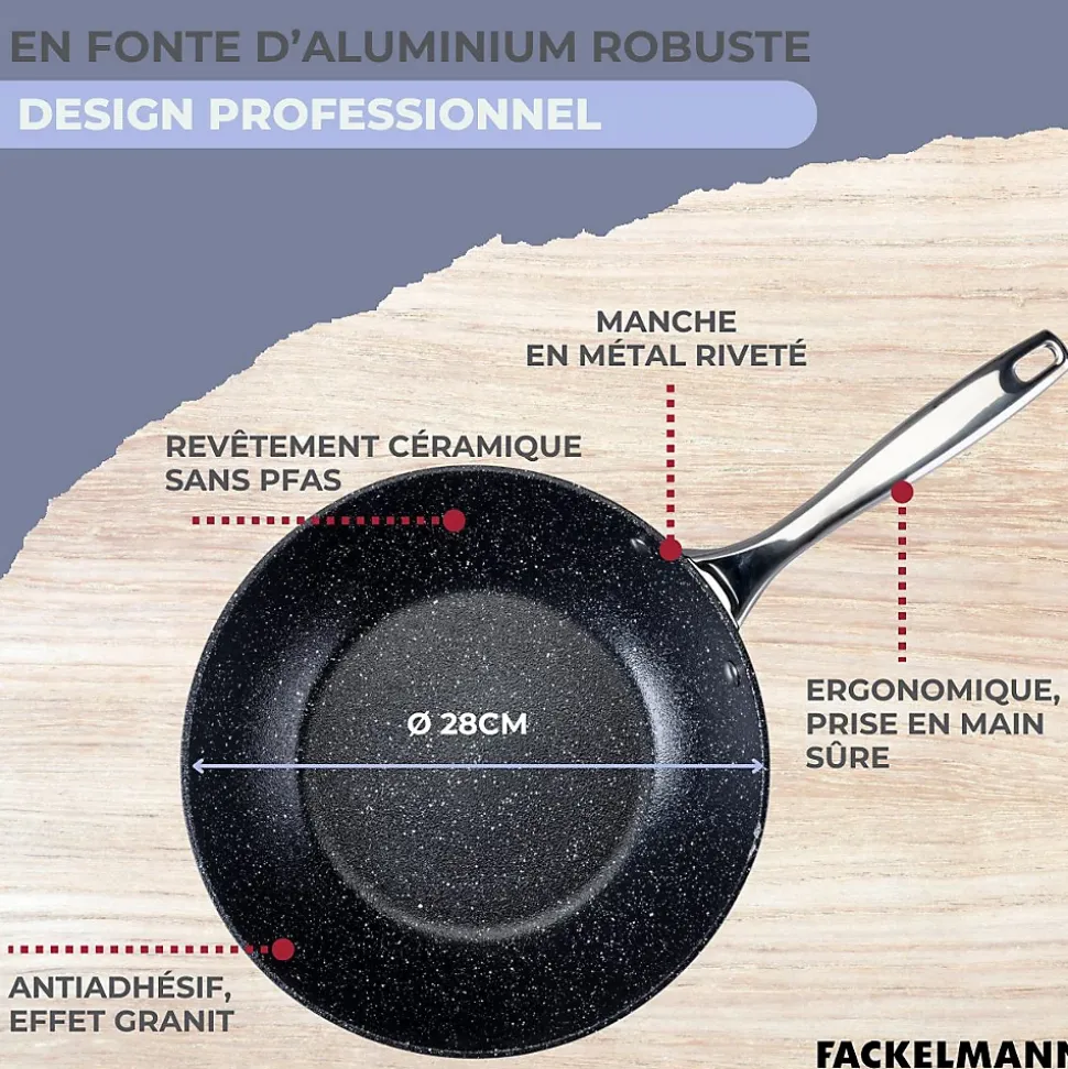 DESCRIPTION : Wok Fackelmann Crossroad 28 cm en aluminium recyclé avec revêtement céramique antiadhésif sans PFAS ; tous types de feux et fourPETIT + : Surface robuste, résistante aux rayures et à l’abrasion pour un usage prolongéCOMPOSITION : Conçu en fonte d’aluminium recyclé avec revêtement céramique antiadhésif sans PFAS pour une cuisson saine et parfaite, sans que vos préparations ne collentDIMENSIONS : 28 cm de diamètre, parfait pour cuisiner des nouilles sautées aux légumes, poulet sauté frit et autres plats asiatiquesUTILISATION : Convient à tous les feux, y compris induction, et peut être utilisée au four jusqu’à 200°ENTRETIEN : Se nettoie facilement à la main avec une éponge et du liquide vaisselleLe Wok Fackelmann Crossroad de 28 cm est l’ustensile idéal pour concocter des plats asiatiques succulents tels que des nouilles sautées aux légumes, un poulet sauté frit ou un Pad Thaï aux crevettes.Fabriqué en fonte d’aluminium recyclé, il dispose d’un revêtement en céramique antiadhésif sans PFAS, assurant une cuisson saine et un nettoyage rapide.Son manche ergonomique en métal riveté assure une prise en main confortable.Compatible avec tous les types de feux, y compris l’induction, et allant au four jusqu’à 200°, il est conçu pour résister aux rayures et à l’abrasion.Avec un design élégant noir à effet granit, ce wok sans PFAS allie esthétique et performance.
