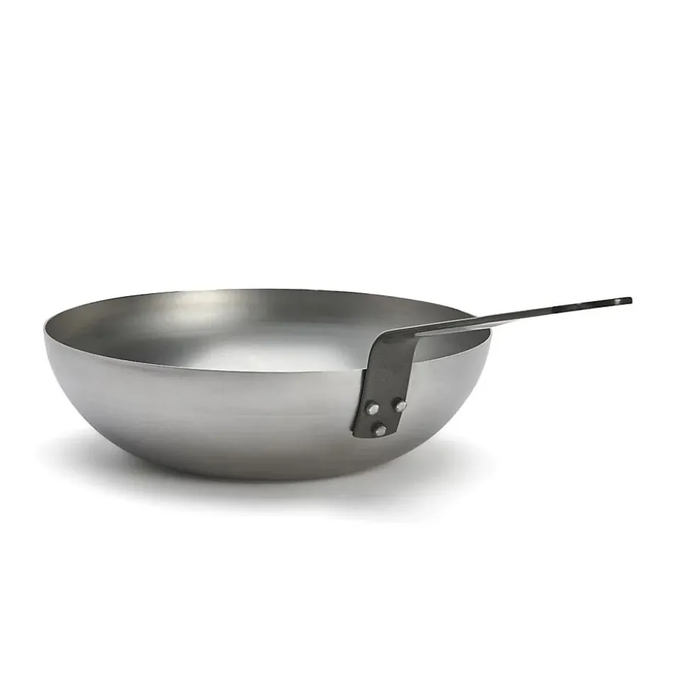 Wok bombé en acier 24cm De Buyer – Wok bombé à queue en tôle d’acier blanche MINERAL BIdéal pour saisir, griller et dorer. L’acier permet la réaction de Maillard, une caramélisation des sucs en surface et un moelleux à l’intérieur.Revêtue de cire d’abeille pour offrir une protection temporaire contre l’oxydation et faciliter le culottage. Culottage progressif apportant une anti-adhérence naturelle.Ce wok est parfait pour une cuisson saine et rapide des aliments. Il permet une cuisine avec peu de matière grasse. Il est idéal pour les poêlées, les légumes sautés, ?Culottage à la première utilisation.Entretien : déglacer, rincer à l’eau chaude, essuyer et huiler légèrement. Ranger dans un endroit sec. Ne pas utiliser de produits détergents ni mettre au lave-vaisselle.Tous feux dont induction. – Corps en tôle d’acier blanche, épaisseur 1,5 mm. Montée rapide en température. Indéformable.Revêtu de cire d’abeilleQueue feuillard courbée à la française ergonomiqueQueue rivetéeDiamètre intérieur haut : 24 cmDiamètre du fond : 11.3 cmHauteur intérieure : 7 cmHauteur totale : 14.3 cmLongueur totale : 43.4 cmLargeur totale : 24.3 cmCompatible tous feux dont induction.Fabrication françaisePoids : 1.1 kg