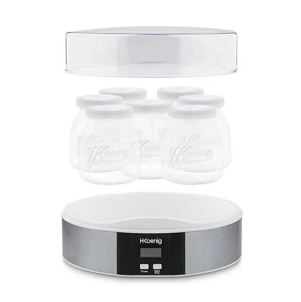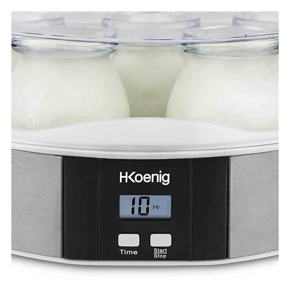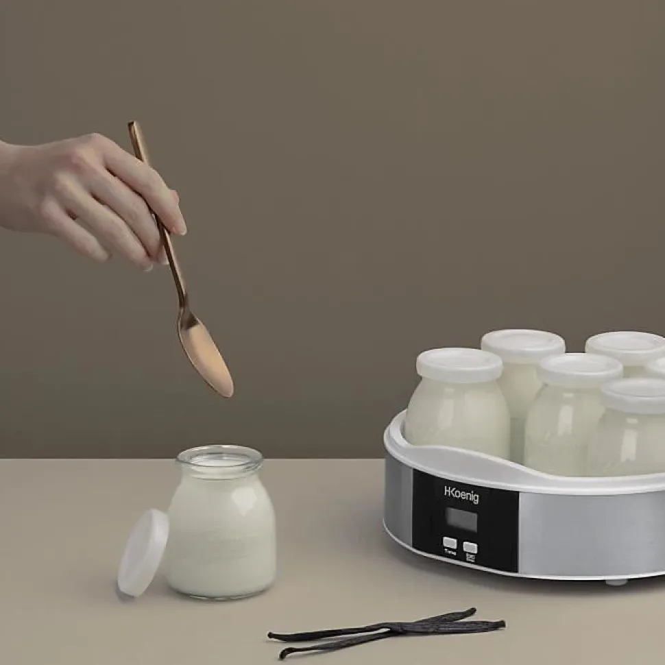 Préparez facilement vos yaourts maison avec la yaourtière H.Koenig ELY70 : capacité totale 1,12 L (7 pots de 160 mL), écran LCD programmable jusqu’à 15 h, corps inox et couvercle transparent, 7 pots en verre compatibles lave-vaisselle, arrêt automatique et signal sonore en fin de cycle, puissance 15 W.
